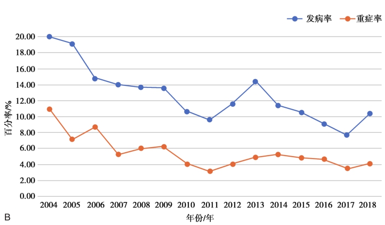 A.深圳地区年度ROP筛查情况例数变化;B.深圳地区ROP筛查年度ROP发病率和重症率(资料来自深圳市眼科医院ROP筛查诊疗团队)。