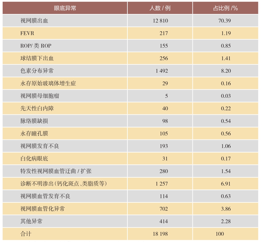 该调查研究发现眼底异常最多见的是视网膜出血,占比高达70.39%,在早产儿中也高达27.32%;值得注意的是,足月新生儿和早产儿两组的眼底疾病排在前三位的病种一样。这些近年发表的大数据调查资料显示,包括中国在内的发展中国家中,新生儿眼底视网膜疾病谱中发现了一些新的病理现象、病理情况,需要解析、补充。它们对于婴幼儿视觉功能形成/发育的影响、对身体健康的影响、是否需要干预和如何合适地进行干预等,成为了小儿眼底病科医生、儿科医生、妇幼保健医生新的研究课题。此外,在我国大于现行早产儿筛查标准出生胎龄、出生体重的早产儿,甚至足月新生儿中,仍然有一定数量会发生ROP。这些都表明了新生儿眼底视网膜疾病早期筛查的重要意义。