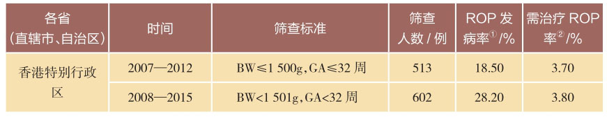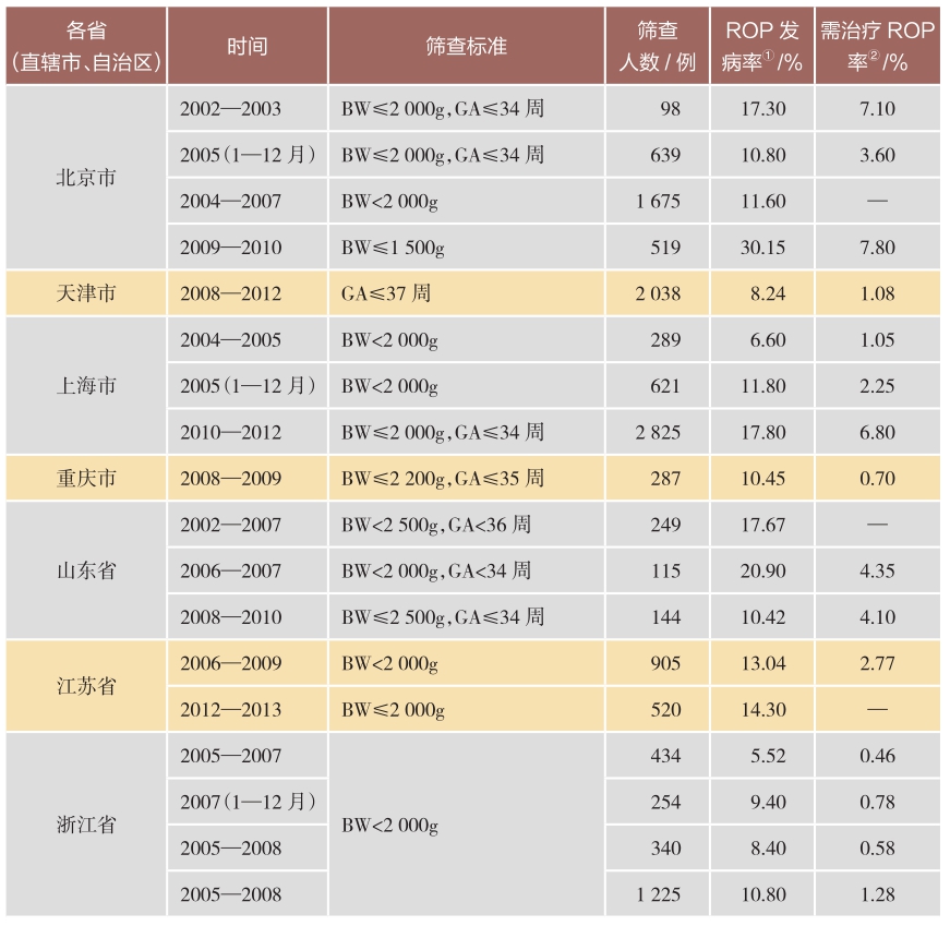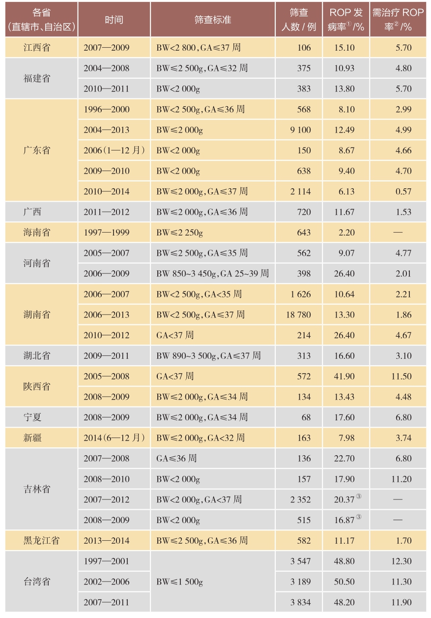 注:“—”为数值缺失。①为符合筛查标准早产儿人群中ROP阳性占比(按严格流行病学定义,可能理解为发现率或发生率,仅供参考)。②为筛查ROP阳性病例中需要治疗者占比,包括阈值病变,Ⅰ型阈值前病变。③通过广角数码小儿视网膜成像系统仪器筛查。ROP,早产儿视网膜病变;BW,出生体重;GA,胎龄