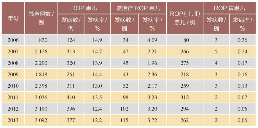 表1-1-7 中国湖南地区2006—2013年ROP筛查年度变化情况