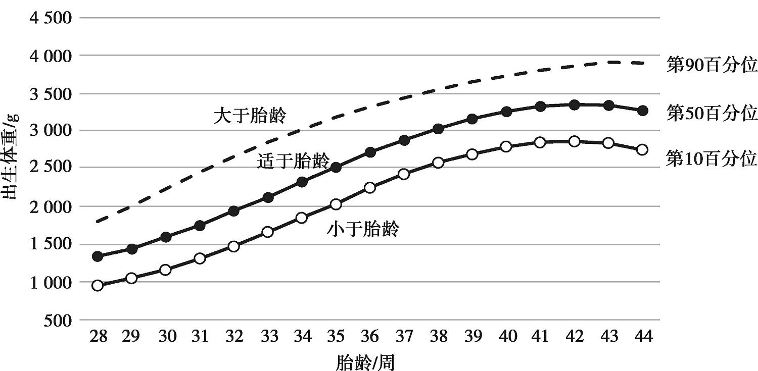 ①小于胎龄儿(small for gestational age infant,SGA):BW在同胎龄儿平均体重第10百分位以下的婴儿;②适于胎龄儿(appropriate for gestational age,AGA):BW在同胎龄儿平均体重第10~90百分位之间的婴儿;③大于胎龄儿(large for gestational age infant,LGA):BW在同胎龄儿平均体重第90百分位以上的婴儿。