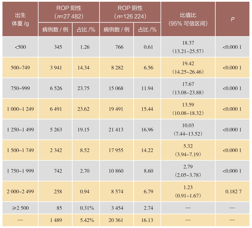 为检验2013年美国《早产儿视网膜病变筛查指南》新版本应用后情况,美国ROP眼科专家Luding等采纳国家医疗保健费用和利用项目儿童住院数据库(The National Healthcare Cost and Utilization Project Kids Inpatient Database)大数据,对早产儿临床资料进行统计分析,发现ROP发病率从2000年的14.70%上升到了2012年的19.88%;体重750~999g早产儿组,ROP发病率为30.20%,体重>2500g早产儿组为2.40%。