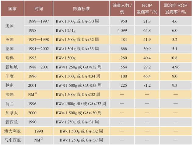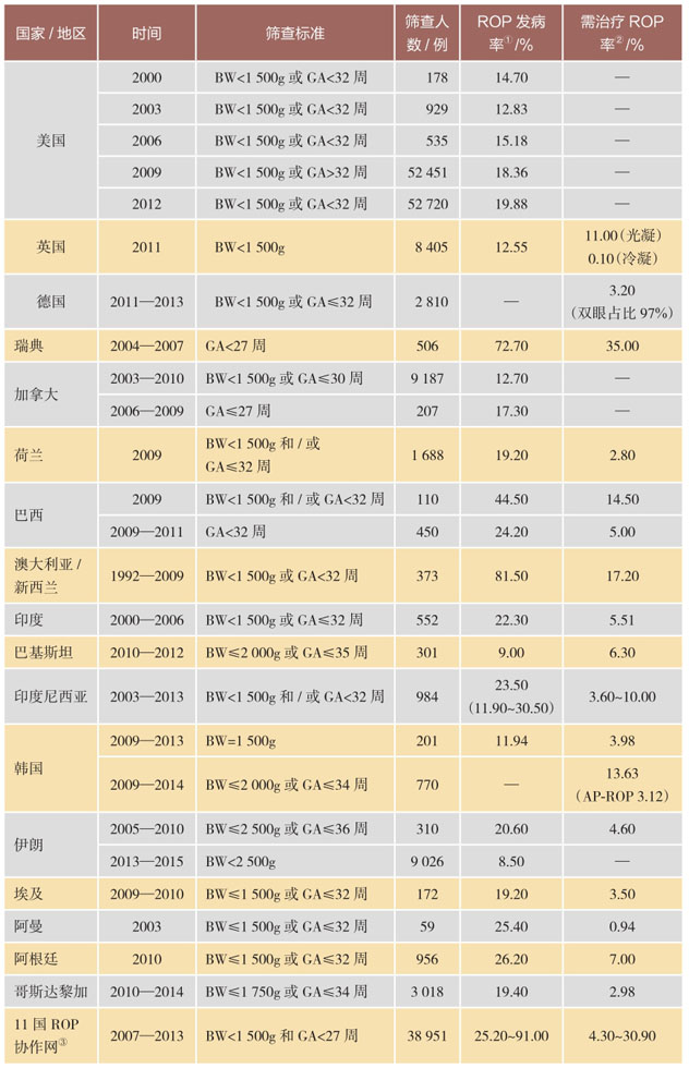 总结自1984年以来的ROP临床与基础研究成果,1997年美国眼科学会、美国小儿眼科学会与斜视学会联合正式发布了《早产儿视网膜病变筛查指南》。有关这个阶段世界各国ROP流行病学发生、发病与治疗情况,汇总见表1-1-2。