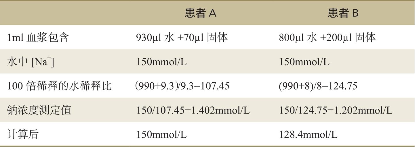 如下例(表15-1):计算的前提是血浆中水相容量保持恒定,间接法测定结果乘以系数107.45得出最终结果。当血浆水含量改变,测定前标本被稀释,测定结果均乘以系数107,患者B结果假性降低。