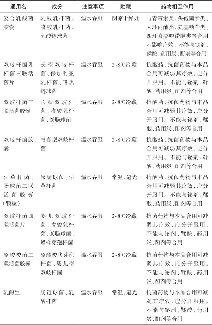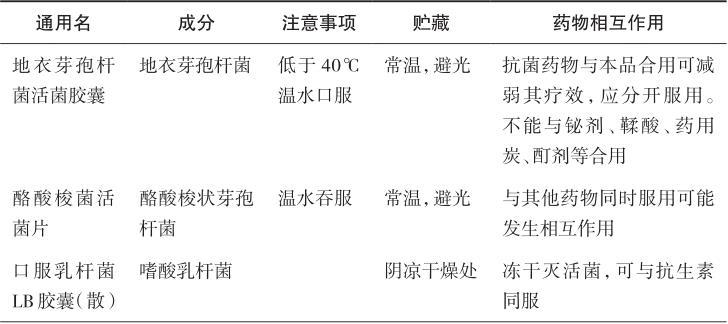 微生态制剂大多数为活菌制剂,抗菌药物对其有抑制和杀灭作用,在使用时应尽量避免同时服用,以防抗菌药物对细菌的敏感作用影响微生态制剂的活性和功效,可错开服药时间2小时;或者先应用抗菌药物控制感染后,再选用微生态制剂调节菌群失调。但是,并不是所有的微生态制剂都不能与抗菌药物联用,也可选用能耐受抗菌药物的微生态制剂。不同微生态制剂的特点见表3-16。