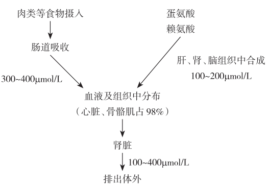 人体内的肉碱含量与饮食、肌肉含量、年龄和性别有关,骨骼肌、心肌和附睾中富集约98%的肉碱,肝和肾约占1.5%,血浆中的肉碱含量极低。体内的肉碱来源可分为内源性和外源性2种,外源性肉碱约占人体需要量的75%,主要由食物,尤其是肉类和牛奶补充。内源性肉碱的合成主要在肝、肾及大脑中进行,现在已知有6种物质是合成肉碱所必需的,即赖氨酸、甲硫氨酸、烟酸、维生素B 6 、维生素C和铁,其中赖氨酸是形成肉碱的基本骨架。肝通过血液可以将机体吸收或自身合成的肉碱以游离或酰基化的形式分布至全身。肉碱以游离形式或酰基肉碱的形式由肾脏排泄,但85%以上被近端肾小管重吸收,其余经尿液排出。正常人的肉碱代谢见图3-1。