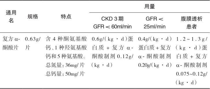 对于慢性肾脏病(chronic kidney disease,CKD)患者,当饮食中的蛋白总量小于每日最小需要量[0.6g/(kg·d)]时,为满足CKD患者的营养需要就必须补充必需氨基酸或酮酸。α-酮酸本身不含有氨基,可利用体内非必需氨基酸的氮转化为氨基酸,从而为机体提供必需氨基酸。低蛋白饮食加复方酮酸制剂治疗有如下优点:①减轻氮质血症,改善代谢性酸中毒;②补充机体所缺的必需氨基酸,改善蛋白质代谢;③减轻胰岛素抵抗,改善糖代谢;④提高酯酶的活性,改善脂代谢;⑤降低高血磷,改善低血钙,减轻继发性甲状旁腺功能亢进;⑥减少蛋白尿排泄,延缓CKD进展。α-酮酸制剂的特点见表3-18。
