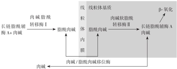 肉碱是一种体内不可缺少的活性成分,其基本功能是辅助长链脂肪酸穿透线粒体内膜进行β-氧化。机体细胞液中的长链脂肪酸的活化形式长链脂酰辅酶A(CoA)不能直接穿过线粒体内膜,需要在位于线粒体内膜外侧的肉碱脂酰转移酶Ⅰ的催化作用下,与肉碱反应转化为脂酰肉碱,再在肉碱/脂酰肉碱移位酶的作用下穿越线粒体内膜进入线粒体基质中。进入线粒体基质的脂酰肉碱又在位于线粒体内膜内侧的肉碱软脂酰转移酶Ⅱ的催化下重新转化为脂酰CoA和肉碱,脂酰CoA在线粒体内进行β-氧化供能,而肉碱在肉碱/脂酰肉碱移位酶的作用下又穿过线粒体内膜回到细胞液中进行下一轮循环转运。通过这一转化代谢,脂酰CoA完成由细胞液转移至线粒体内进行β-氧化,参与机体的各种代谢及供能过程。具体过程见图3-2。