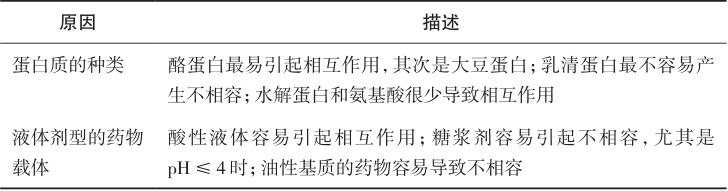 由各种原因导致的不能经口进食或消化吸收功能受损的患者需要通过管饲来提供营养支持。在体外,营养素与药物相互作用主要发生在两者的直接物理接触过程中,例如在营养液配制过程中、输液袋中以及液体输注系统中。这种不相容导致形成颗粒、凝胶或出现分层,以致阻塞管道,影响营养素的吸收和利用。将酸性药剂糖浆加到肠内营养配方中,原有的乳剂状态就会被破坏,这种情况一般发生在全蛋白配方中。此外,蛋白质的种类及液体剂型的药物载体也会影响药物与肠内营养配方的相容性。药物与肠内营养配方的不相容性具体见表4-3。