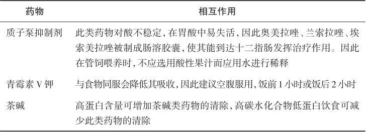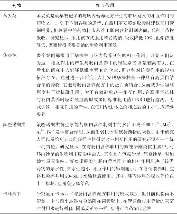 药物的剂型、治疗窗、效价、辅料、渗透压、黏度、溶解性等都会影响相互作用的发生。治疗窗较窄的药物如茶碱、苯妥英钠、地高辛,某些具有强大药理作用的药物如抗凝血药在与EN合用时应注意监测。表4-4列举出一些常见的药物与肠内营养配方的相互作用。