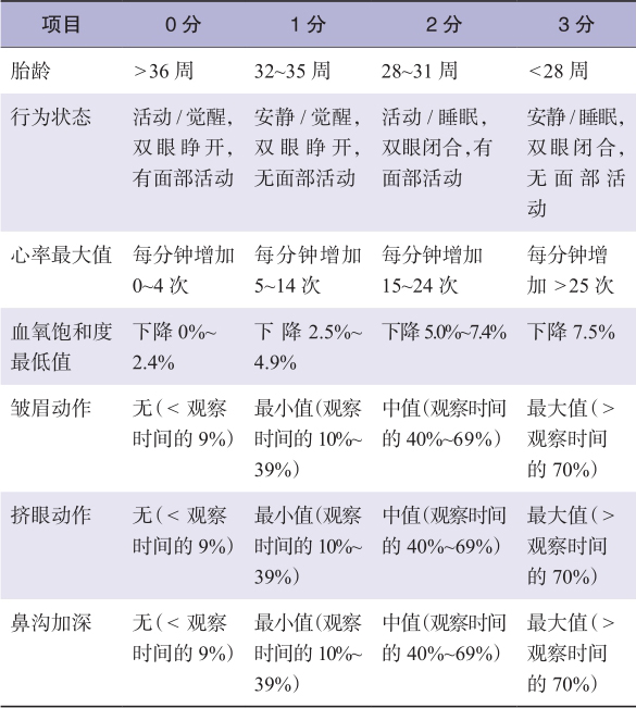 [引自:Stevens B,Johnston C,Petryshen P,et al.Premature Infant Pain Profile:development and initial validation.Clin J Pain,1996,12(1):13-22.]