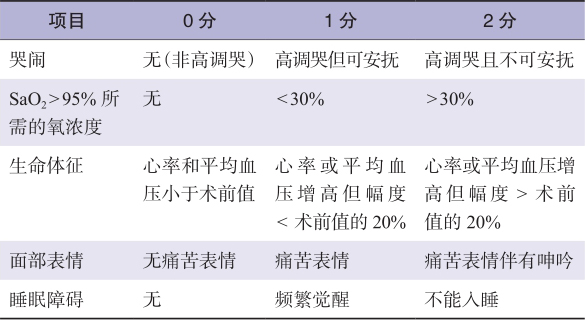 由美国Missouri大学制订,用于评估术后疼痛,足月儿、胎龄>32周的早产儿的疼痛评分(表1-4)。CRIES量表评估内容包括哭闹,氧饱和度>95%所需的氧浓度,生命体征(心率和血压)升高,面部表情和失眠5项内容,以5个指标首字母命名。各项的分值为0~2分,总分为10分,>3分则应镇痛治疗,4~6分为中度疼痛,7~10分为重度疼痛。其中生命体征在最后测量,以免惊醒早产儿,睡眠障碍是基于记录1小时前的观察结果。