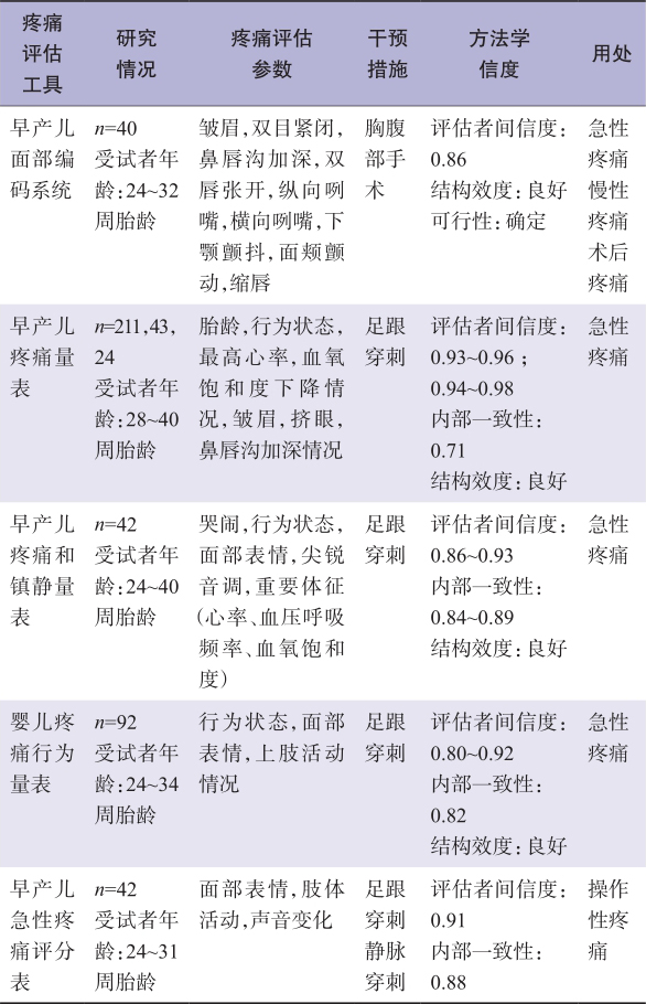 由于行为变化和生理生化指标都有其局限性,这提示对于早产儿疼痛的评估应该从生理生化指标和行为变化等方面进行综合测评,即需要一个综合各种维度的疼痛评估工具,用以对早产儿疼痛进行准确测量。目前有超过40种评估早产儿疼痛的工具,这些工具已经被一些作者沿用。有学者在呼吁验证现有的工具而不是开发更多的工具。在不同的疼痛状况或临床情况下,没有一种工具被认为是可以通用的。目前早产儿疼痛的评估工具可分为两类:单维度评估工具和多维度评估工具。