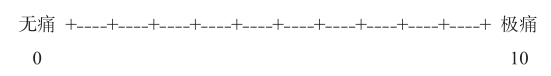 注:长10cm,定某一点,得1~10中的某一分。0cm:0分,无痛,无任何疼痛感觉;1~3cm:1~3分,轻度疼痛,不影响工作、生活;4~6cm:4~6分,中度疼痛,影响工作,不影响生活;7~10cm:7~10分,重度疼痛,疼痛剧烈,影响工作及生活