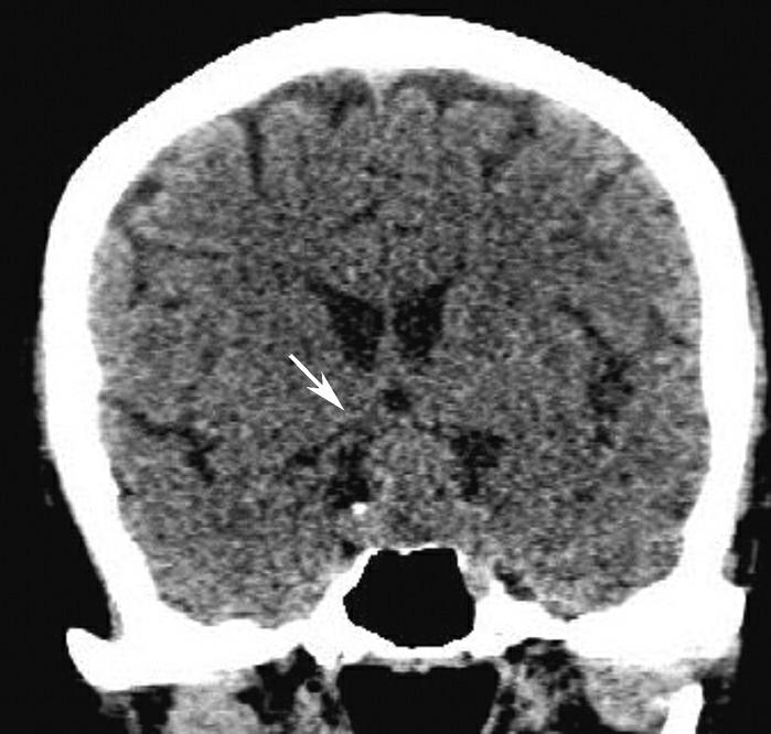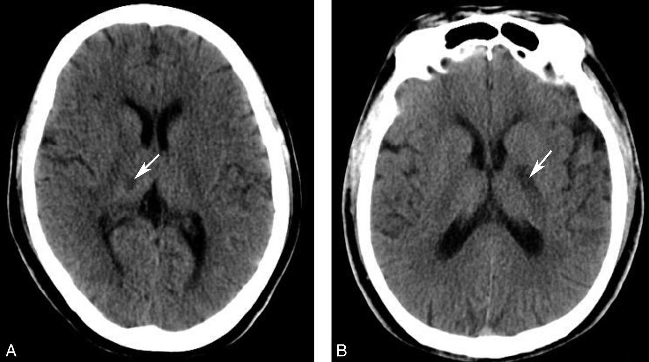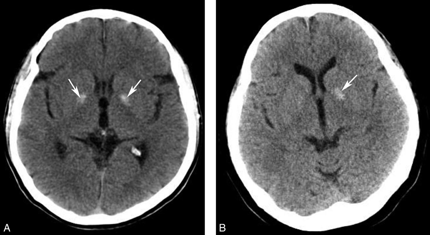 A.双侧苍白球对称性钙化,呈高密度影(箭);B.左侧苍白球钙化(箭),右侧苍白球钙化不明显