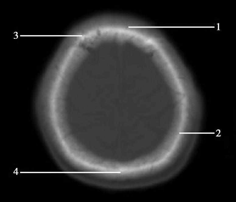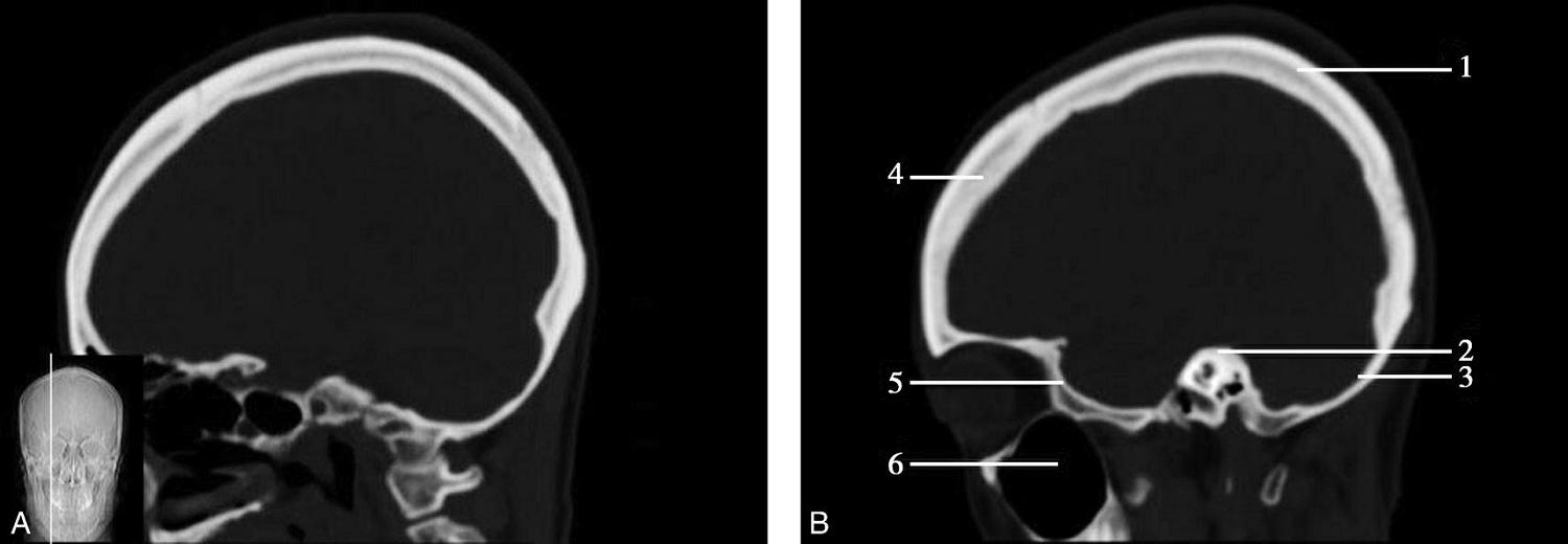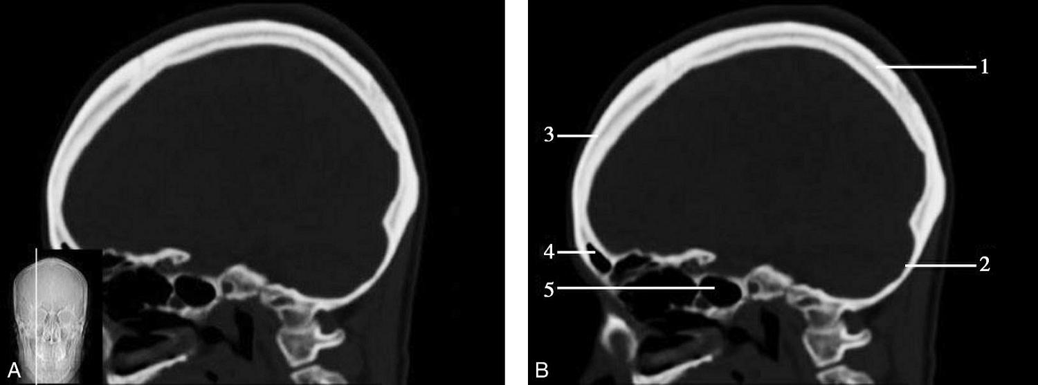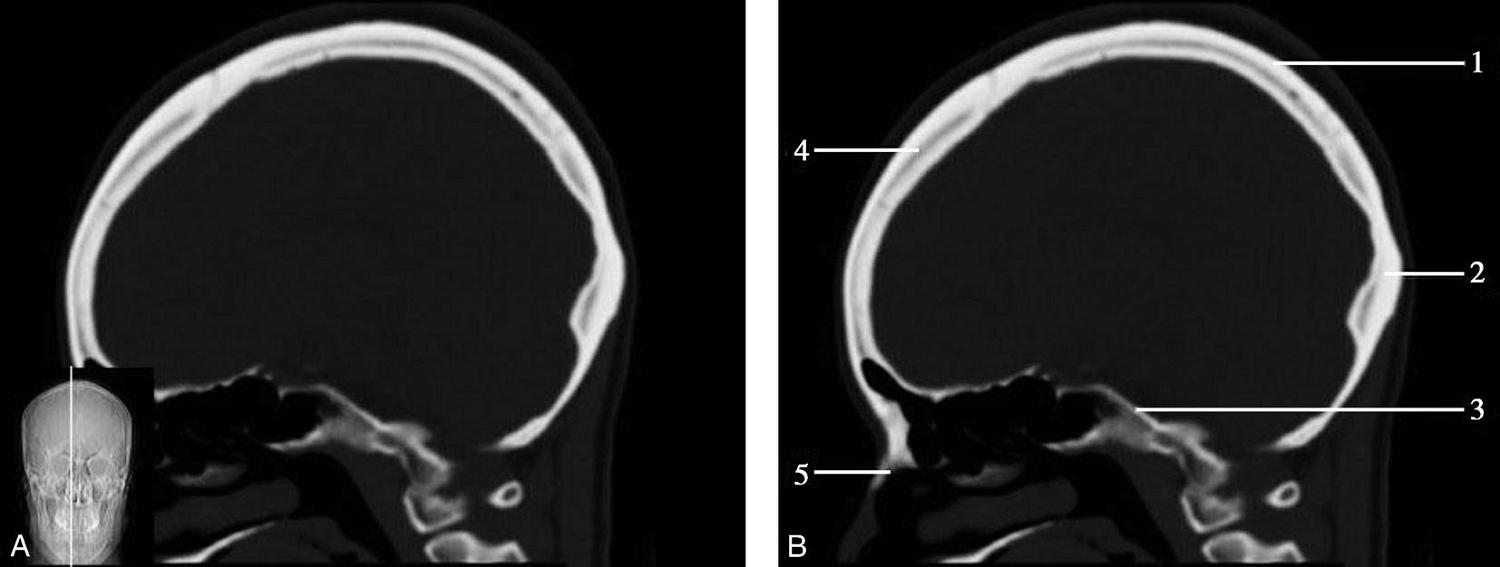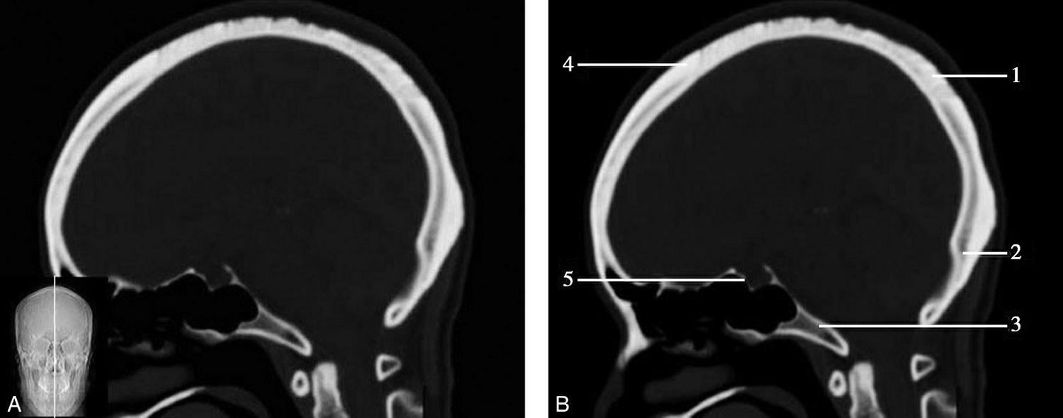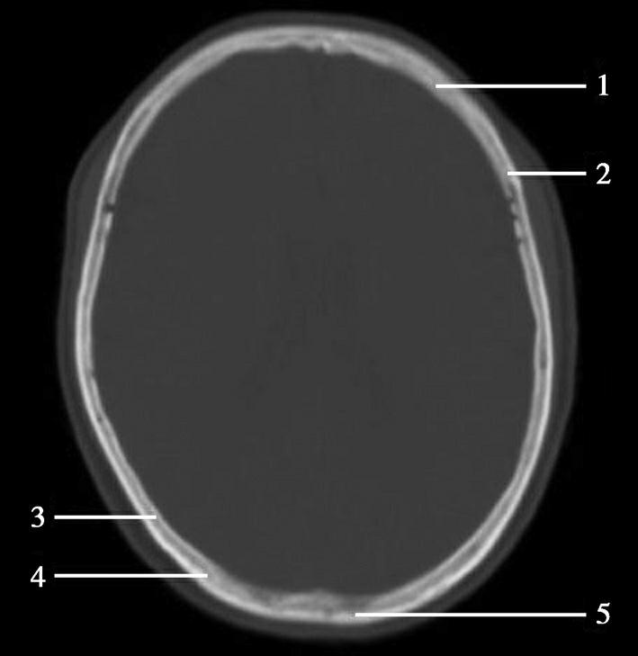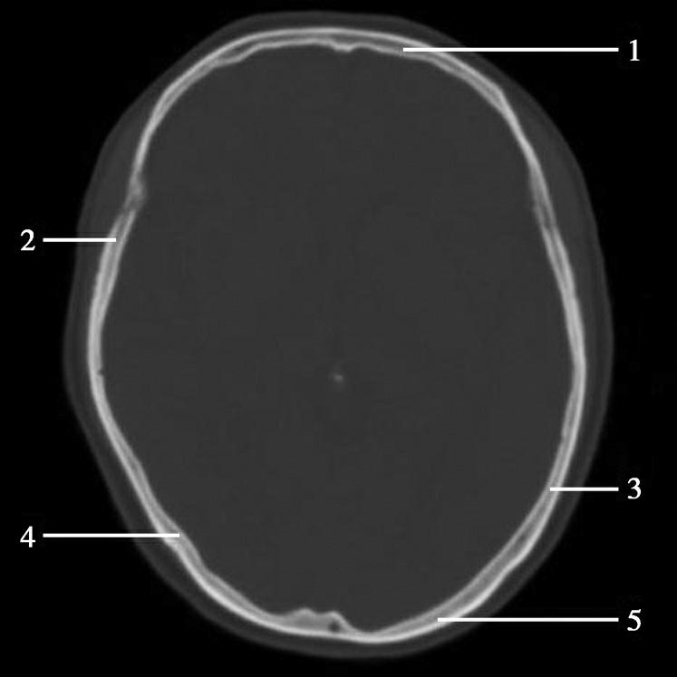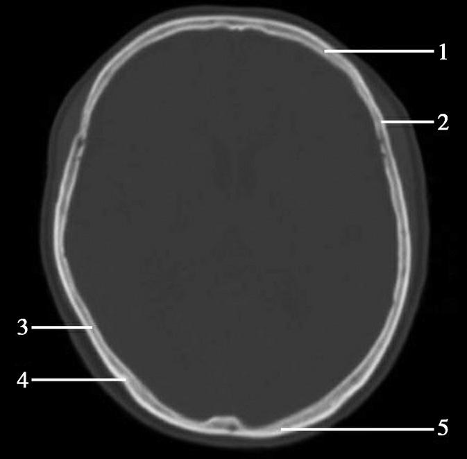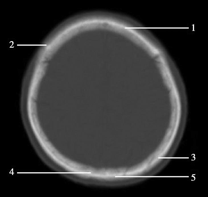 1.额骨;2.冠状缝;3.顶骨;4.人字缝;5.枕骨