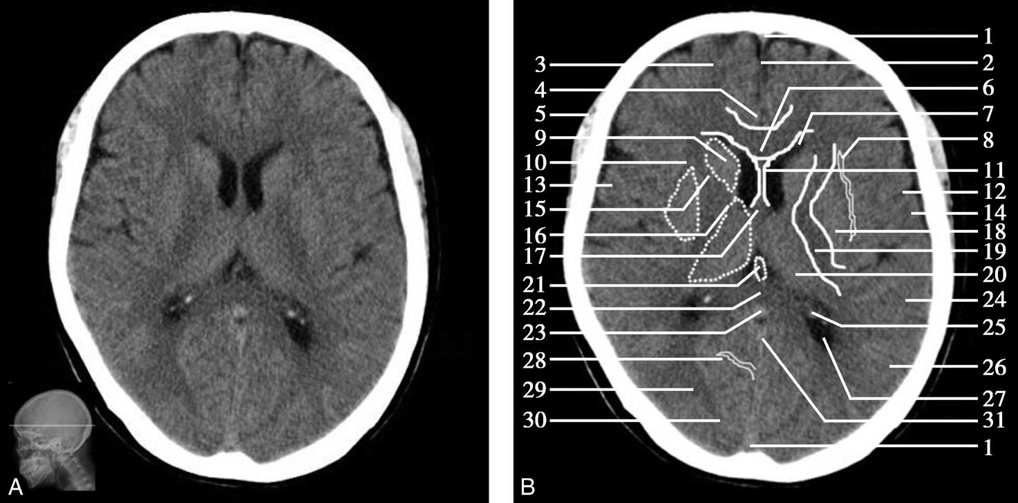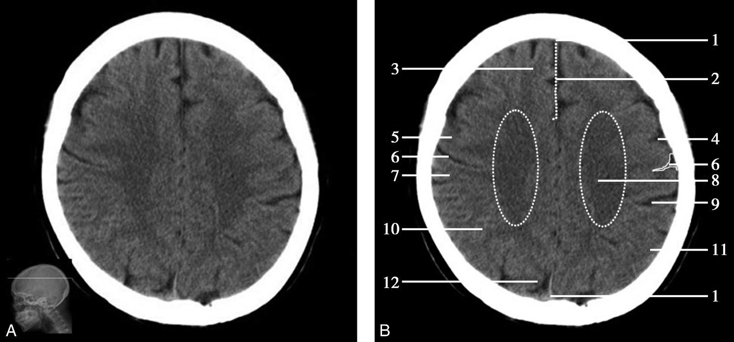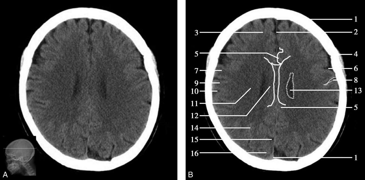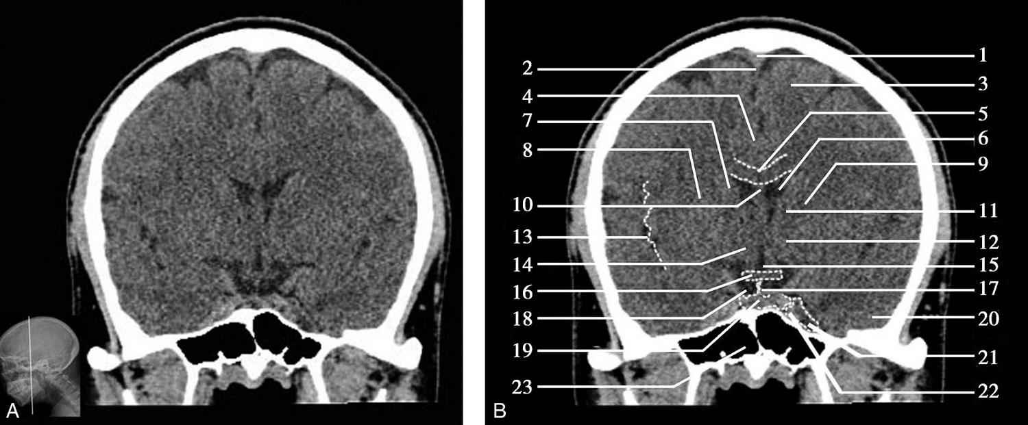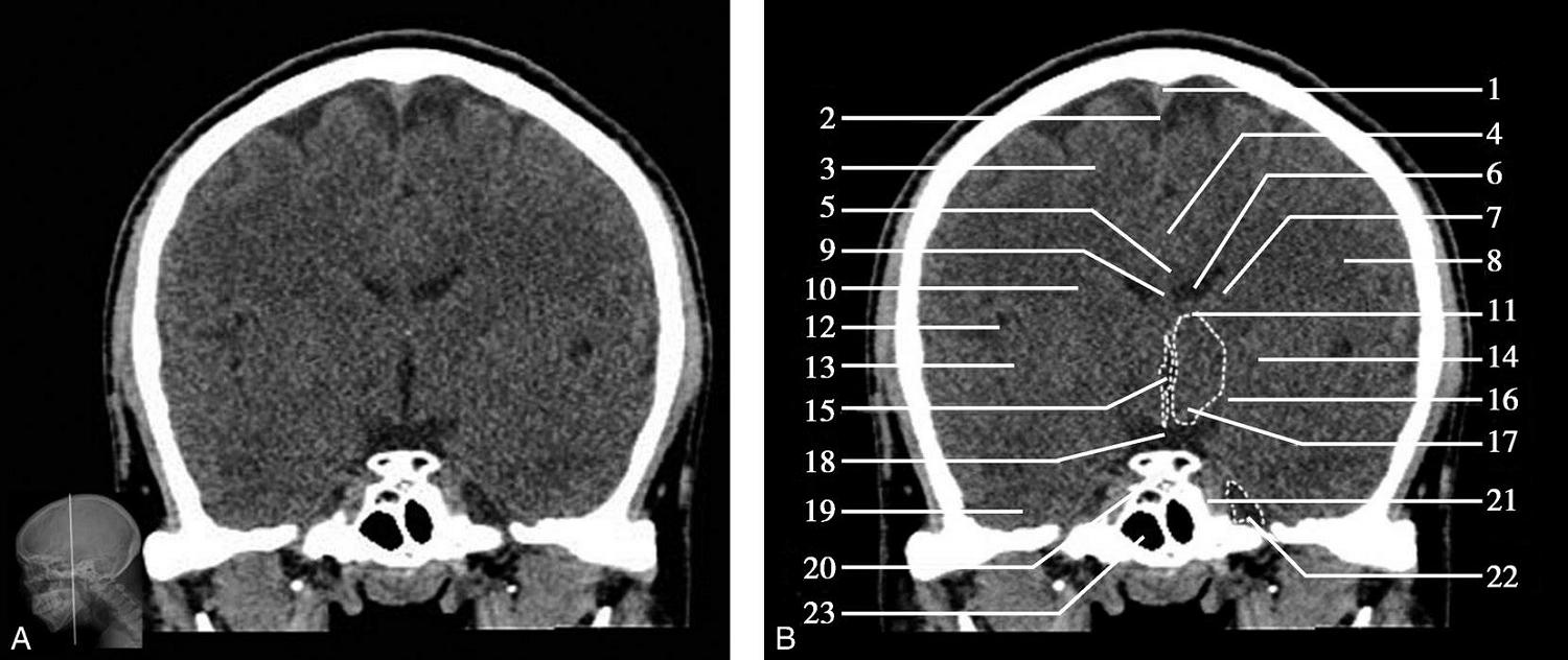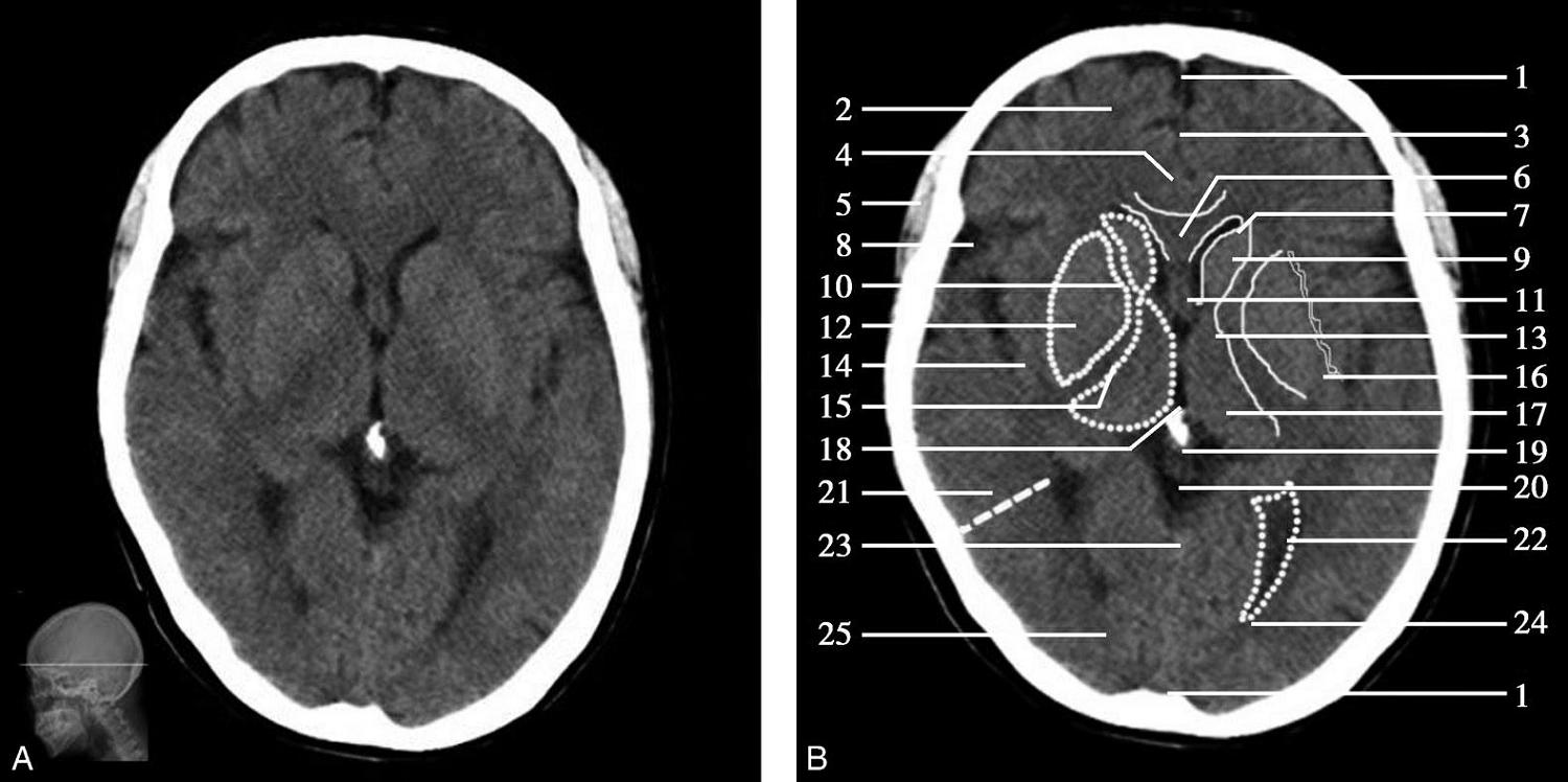 1.上矢状窦;2.额叶;3.大脑镰;4.扣带回;5.颞肌;6.胼胝体膝部;7.侧脑室前角;8.外侧裂池;9.尾状核头部;10.内囊前肢;11.透明隔;12.豆状核;13.内囊膝部;14.岛叶;15.内囊后肢;16.外囊;17.丘脑;18.第三脑室;19.松果体(钙化);20.大脑内静脉;21.颞叶;22.侧脑室三角区;23.直窦;24.侧脑室后角;25.枕叶