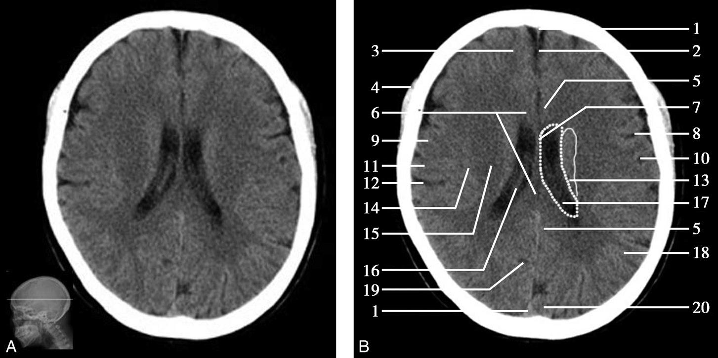 1.上矢状窦;2.大脑镰;3.额叶;4.颞肌;5.扣带回;6.胼胝体;7.透明隔;8.中央前沟;9.中央前回;10.中央沟;11.中央后回;12.中央后沟;13.尾状核体部;14.岛盖;15.放射冠;16.脉络膜丛;17.侧脑室体部;18.顶叶;19.顶枕沟;20.枕叶