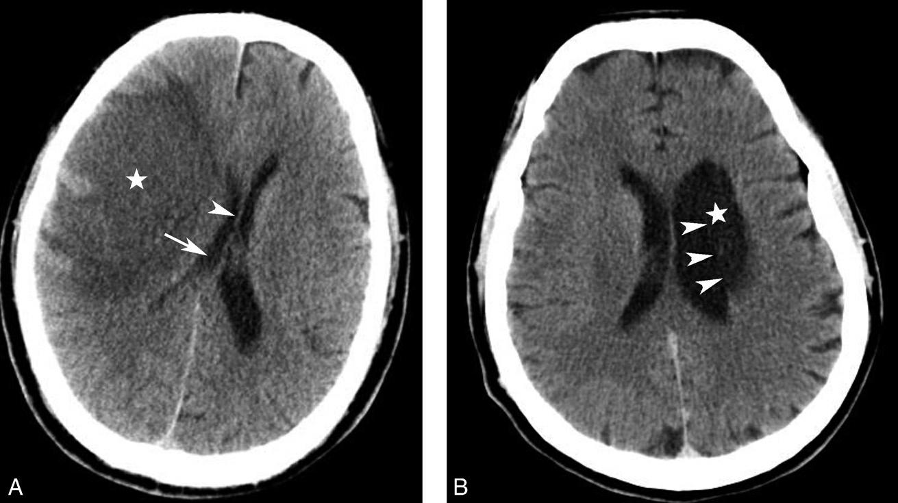 A.右侧大脑半球转移瘤瘤周水肿(☆)引发的占位效应致右侧侧脑室明显受压变形、变小(箭),透明隔向左侧移位(箭头);B.左侧侧脑室旁陈旧性脑梗死、脑软化(☆),病灶体积缩小引发的负占位效应致左侧侧脑室体部外展、扩大(箭头)