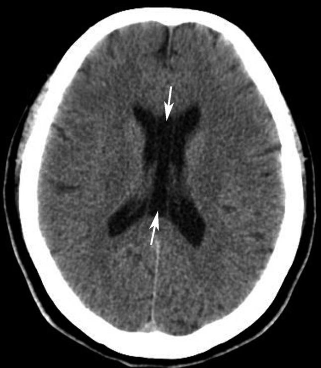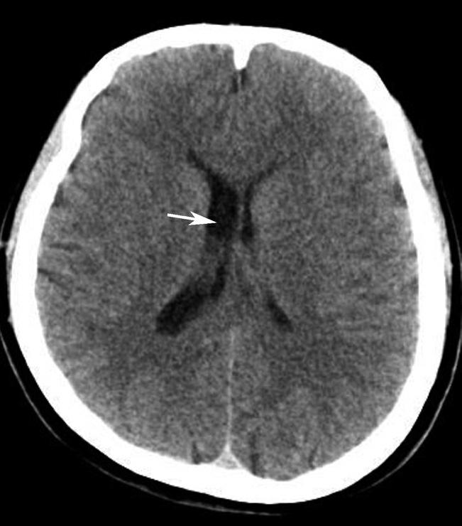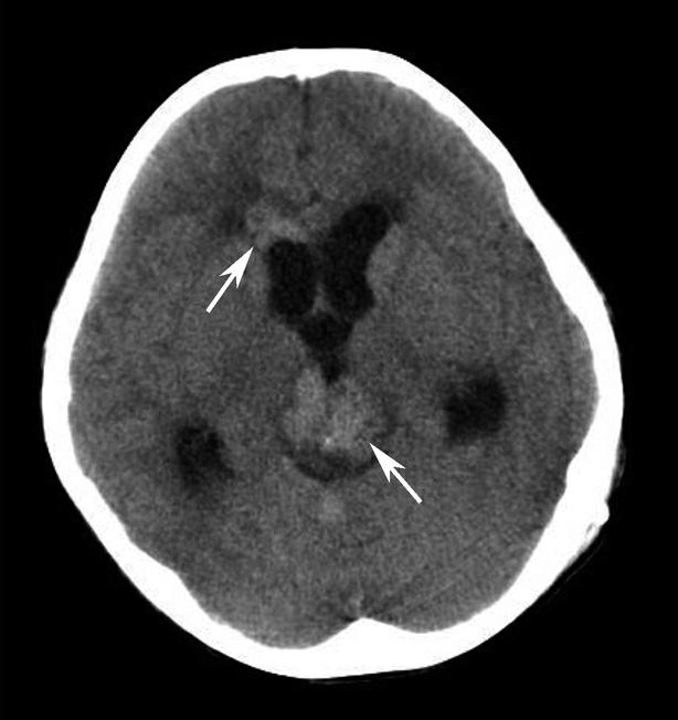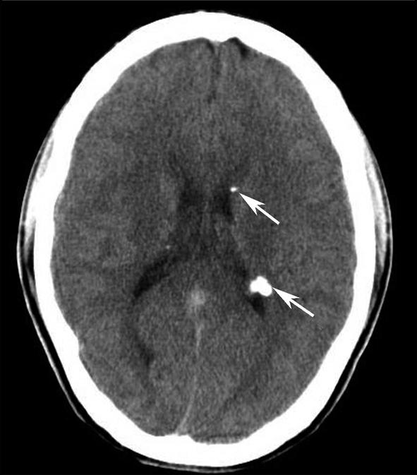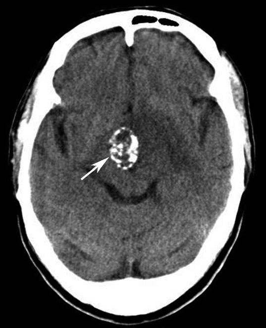松果体区及右侧侧脑室前角区多发团状高密度影(箭),中线结构居中。幕上脑室扩大、积水