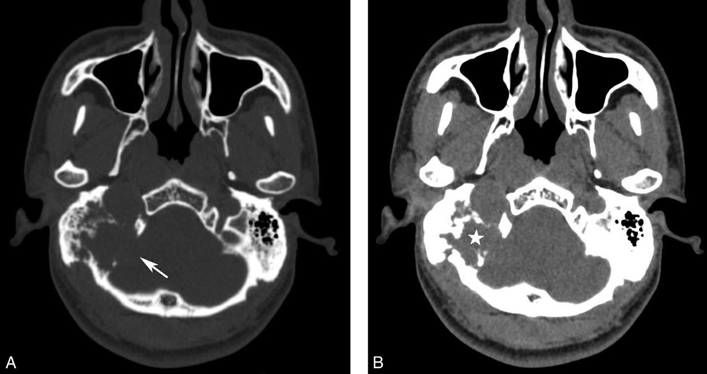 右侧颈静脉孔区不规则骨质破坏(箭),局部见软组织肿块(☆)