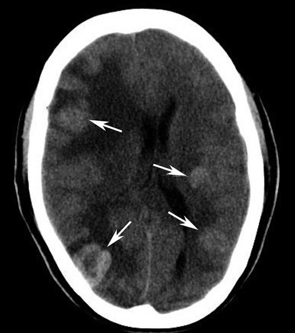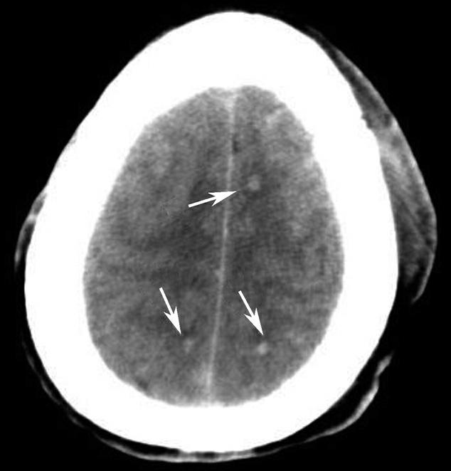 双侧大脑半球脑实质内多发类圆形病灶(箭),密度高于脑灰质,大部分病灶周围可见片状水肿影。右侧脑室受压、变窄,中线结构向左移位