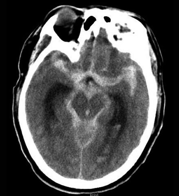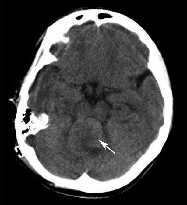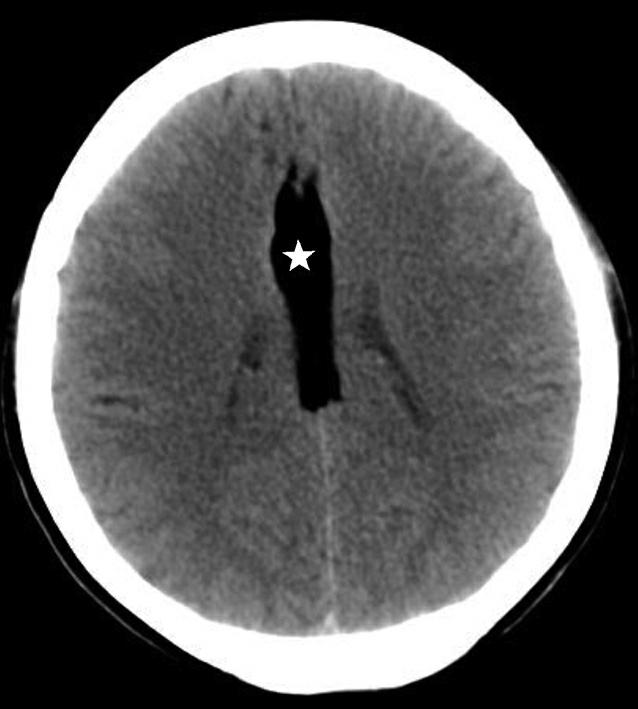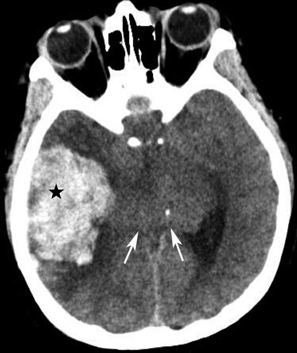 右侧颞叶脑内大血肿(★),产生严重的占位效应,环池受压闭塞(箭),脑疝形成