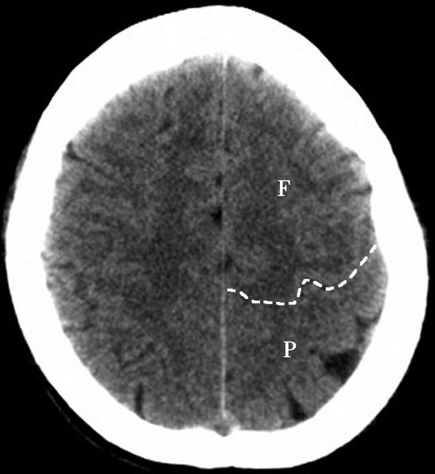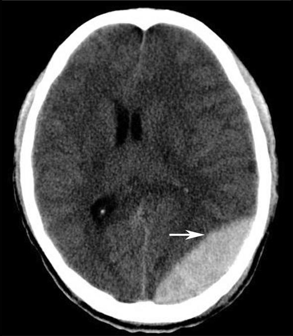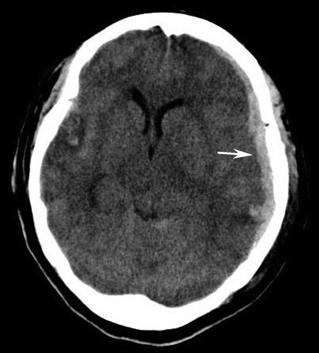 左侧额颞顶部硬膜下示新月形高密度影(箭),中线结构右移