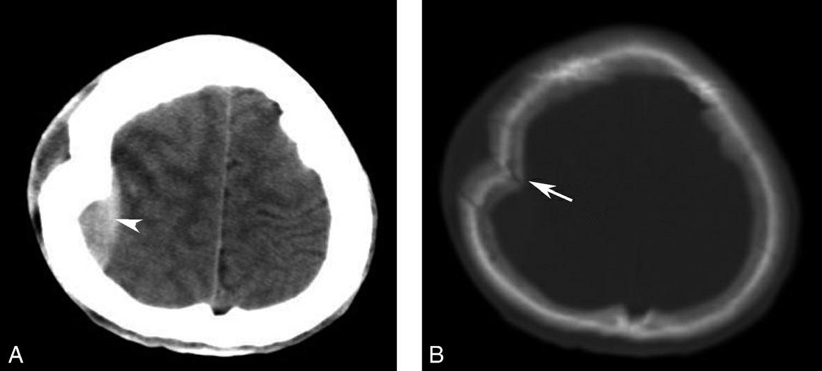 A.右颞顶部硬膜外血肿呈颅骨内板下梭形高密度影(箭头);B.骨窗示右顶骨多发线形骨折线(箭),局部骨质明显向内凹陷