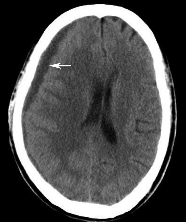 右侧额颞部硬膜下示新月形低密度影(箭),中线结构左移