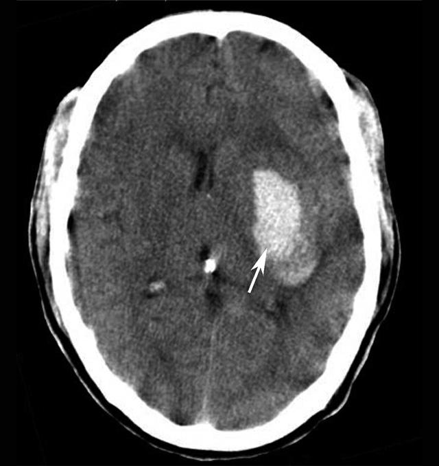 左侧基底节区示一团块状高密度病变(箭),CT值约为80HU,周边示轻度低密度水肿影。左侧侧脑室受压,中线结构右移