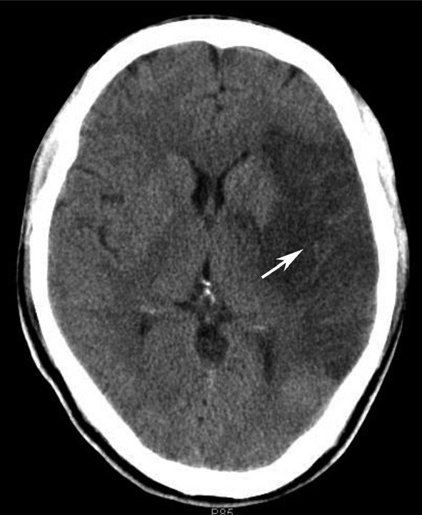 左侧额、颞、岛、顶叶及左侧基底节区示大片状低密度影(箭),边界不甚清晰,相应脑沟及脑裂变窄;左侧侧脑室受压、变窄