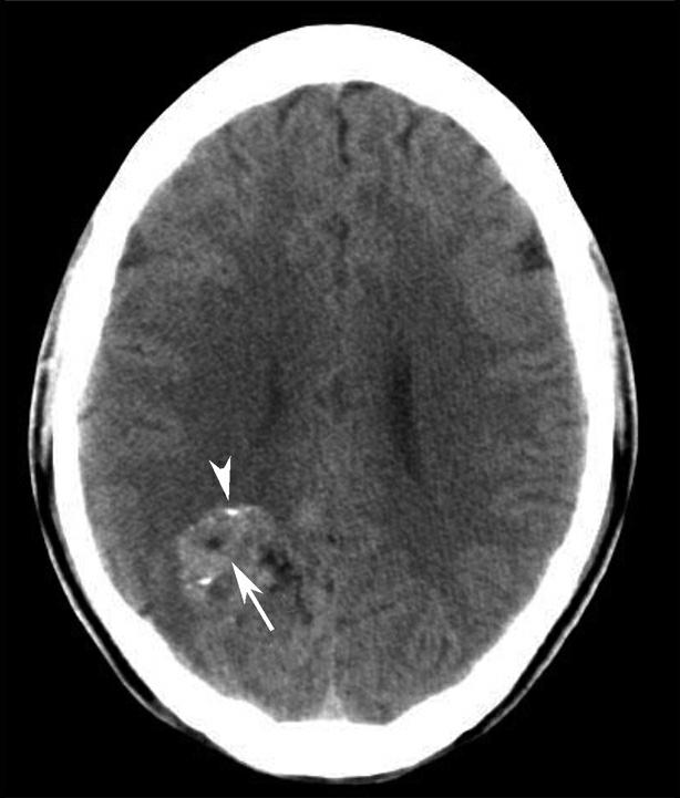 右侧顶枕叶示多发粗细不均的迂曲条状稍高密度影堆积成团(箭),其内可见多发斑片状高密度钙化影(箭头),周围未见明显水肿