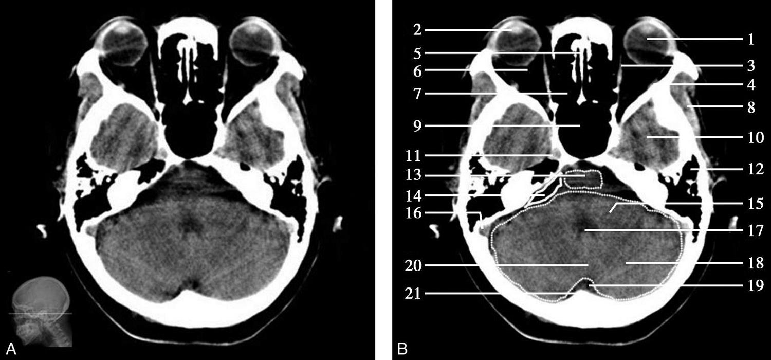 1.眼球;2.晶状体;3.内直肌;4.外直肌;5.鼻中隔;6.视神经;7.筛窦;8.颞肌;9.蝶窦;10.颞叶;11.颈内动脉;12.乳突;13.脑桥;14.脑桥小脑角池;15.桥臂;16.乙状窦;17.第四脑室;18.小脑半球;19.枕大池;20.小脑蚓部;21.枕内隆凸