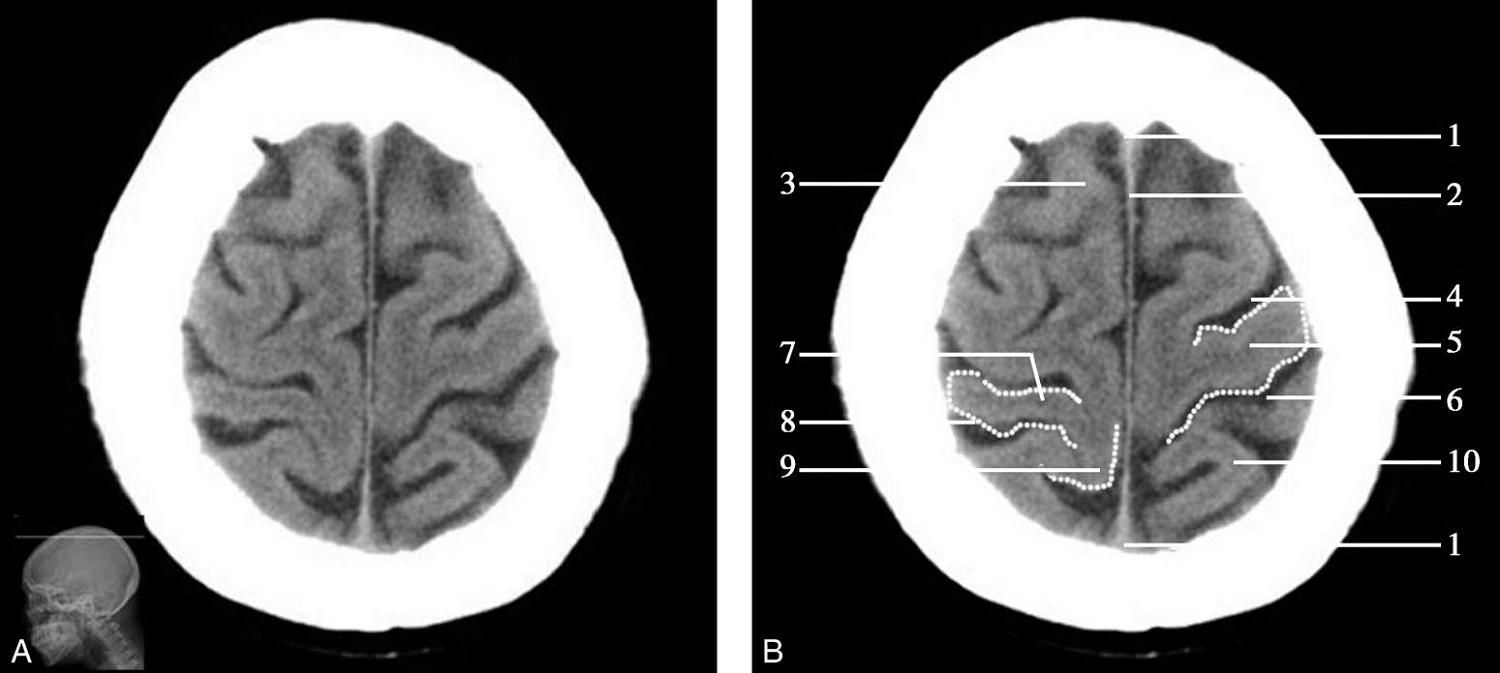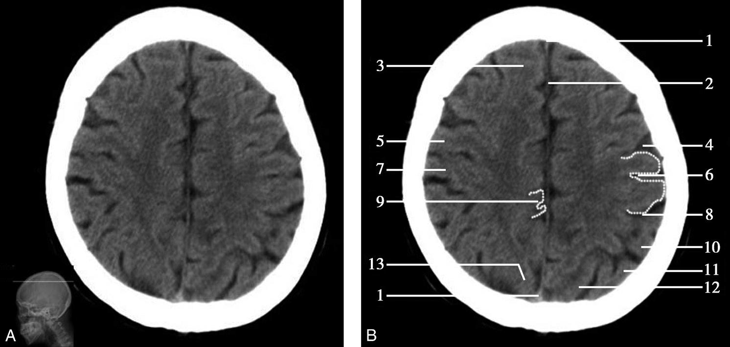 重要结构:放射冠、胼胝体体部、侧脑室顶部、中央沟、扣带回(图1-2-40、图1-2-41)。