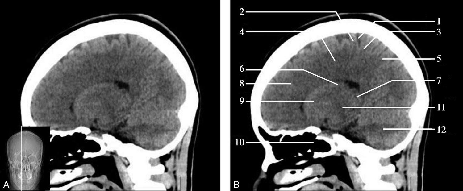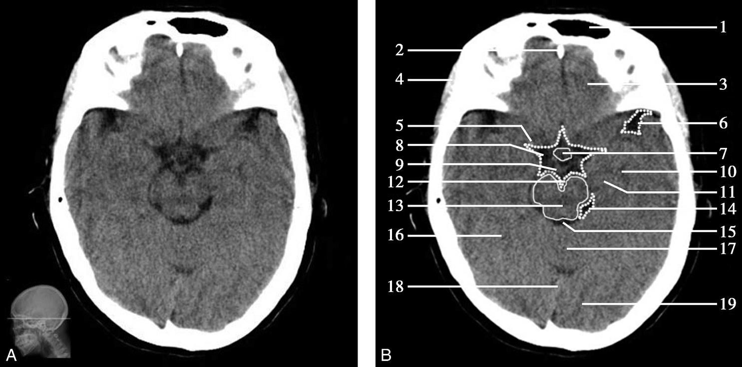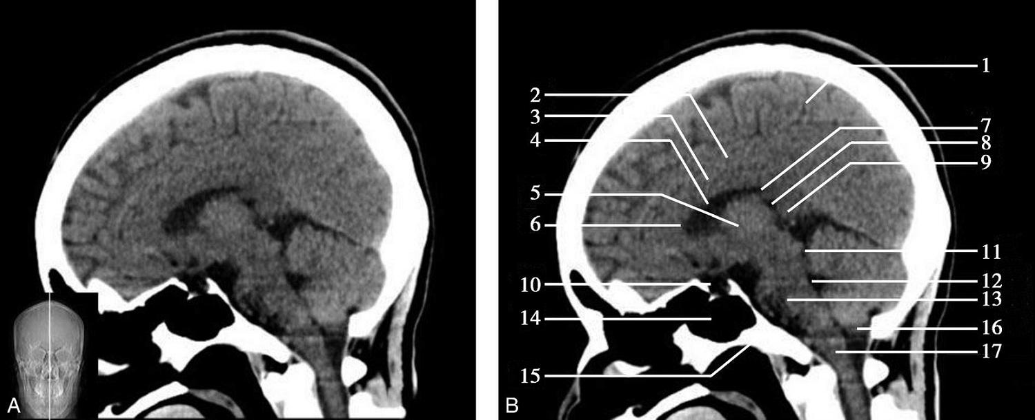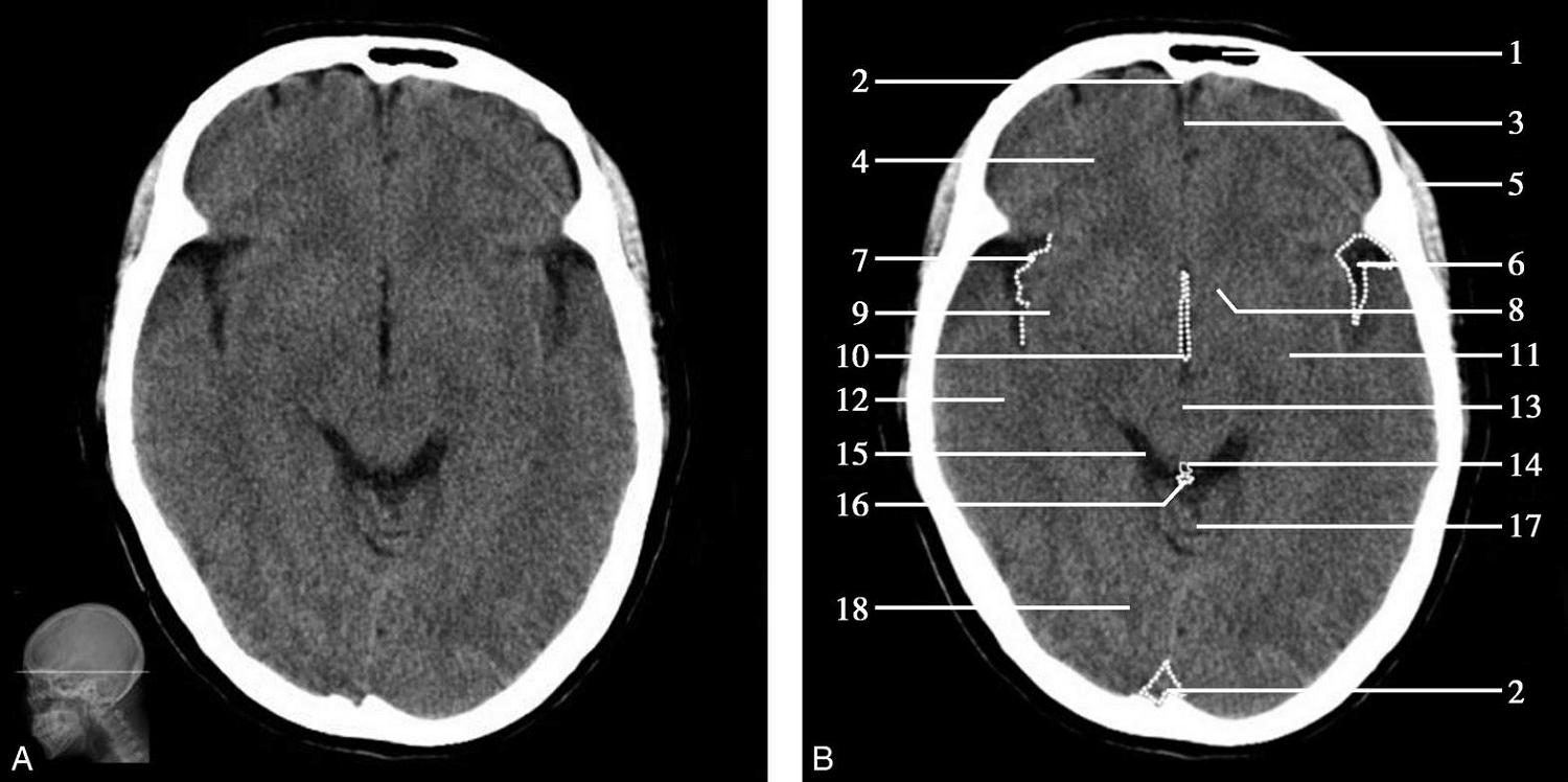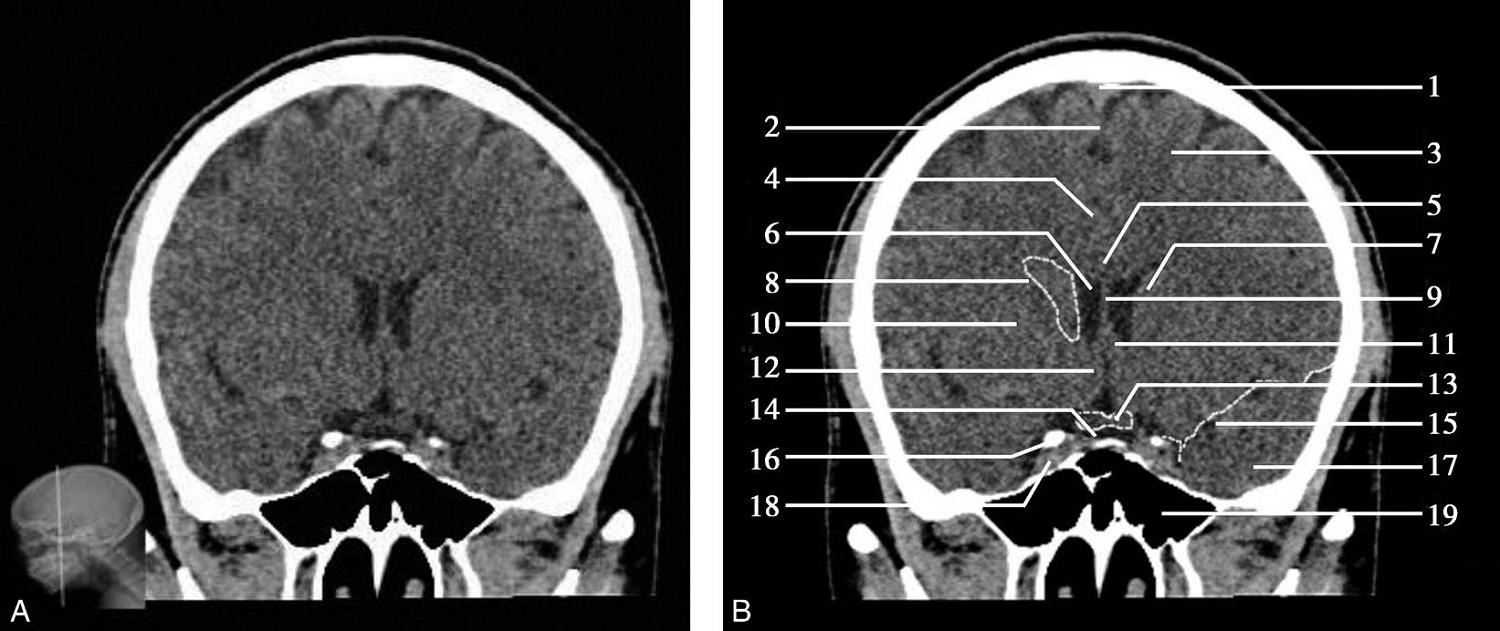 1.额窦;2.上矢状窦;3.大脑镰;4.额叶;5.颞肌;6.外侧裂;7.岛叶;8.尾状核头;9.外囊;10.第三脑室;11.豆状核;12.颞叶;13.中脑;14.中脑导水管;15.环池;16.四叠体池;17.小脑上蚓部;18.枕叶