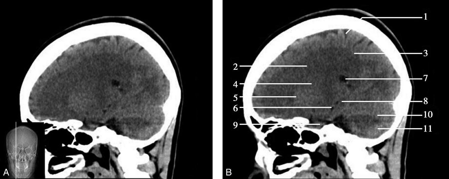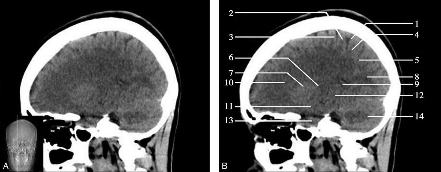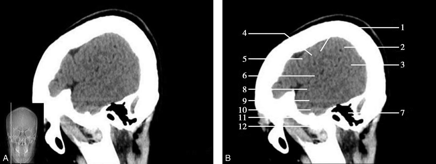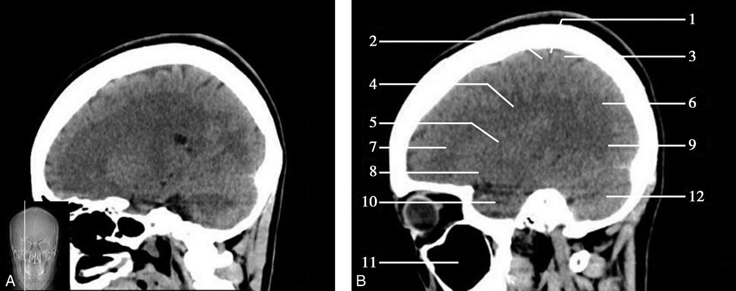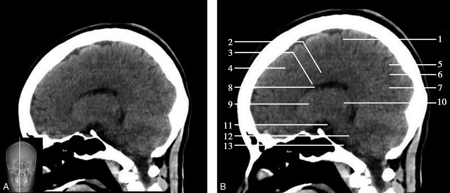 1.额窦;2.上矢状窦;3.大脑镰;4.额叶;5.颞肌;6.外侧裂;7.岛叶;8.尾状核头;9.外囊;10.第三脑室;11.豆状核;12.颞叶;13.中脑;14.中脑导水管;15.环池;16.四叠体池;17.小脑上蚓部;18.枕叶