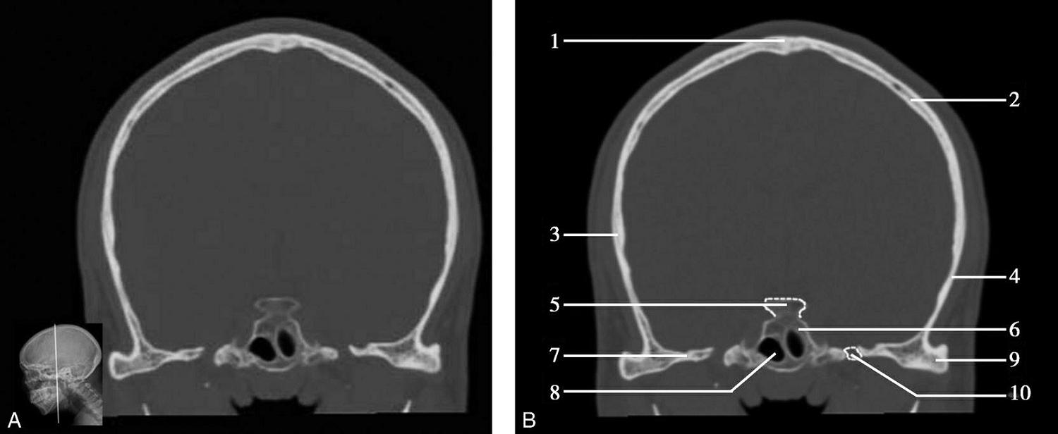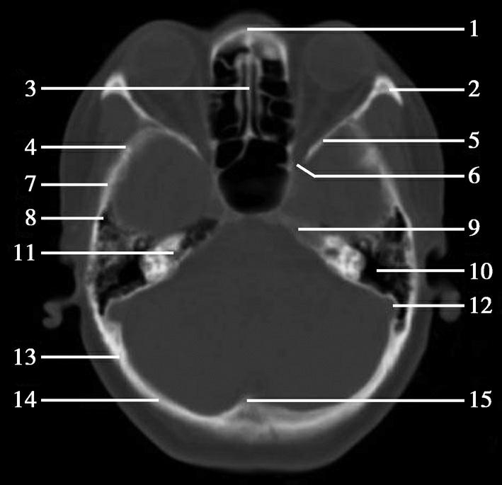 1.鼻骨;2.额骨眶突;3.鼻中隔;4.蝶鳞缝;5.蝶骨小翼;6.眶上裂;7.颞骨鳞部;8.乳突;9.颞骨岩部尖;10.鼓窦;11.内听道;12.乙状窦;13.枕乳突缝;14.枕骨;15.枕内隆凸