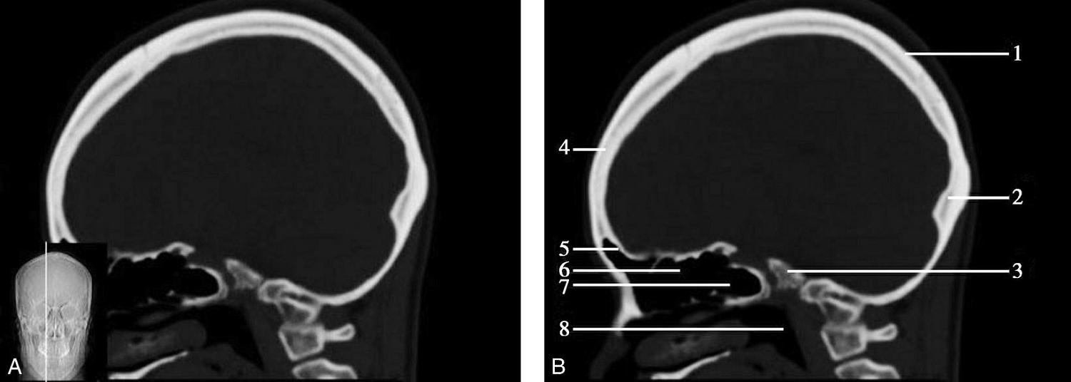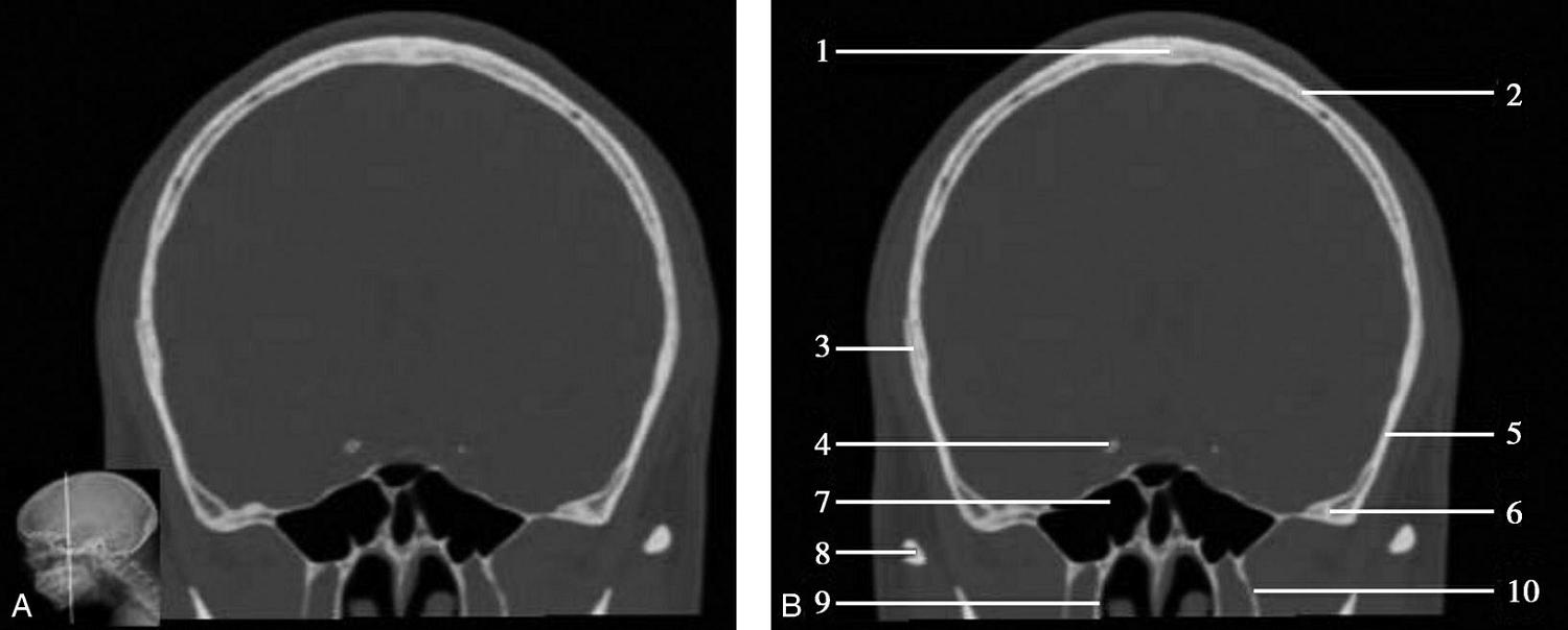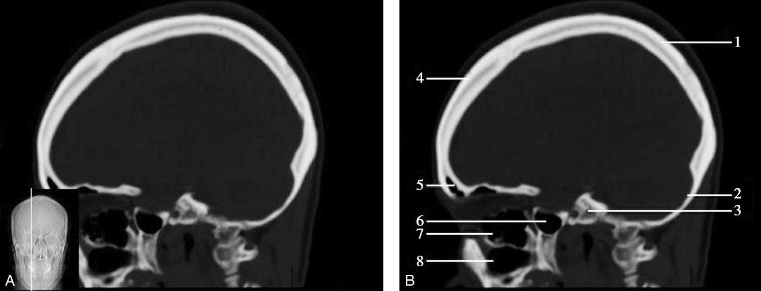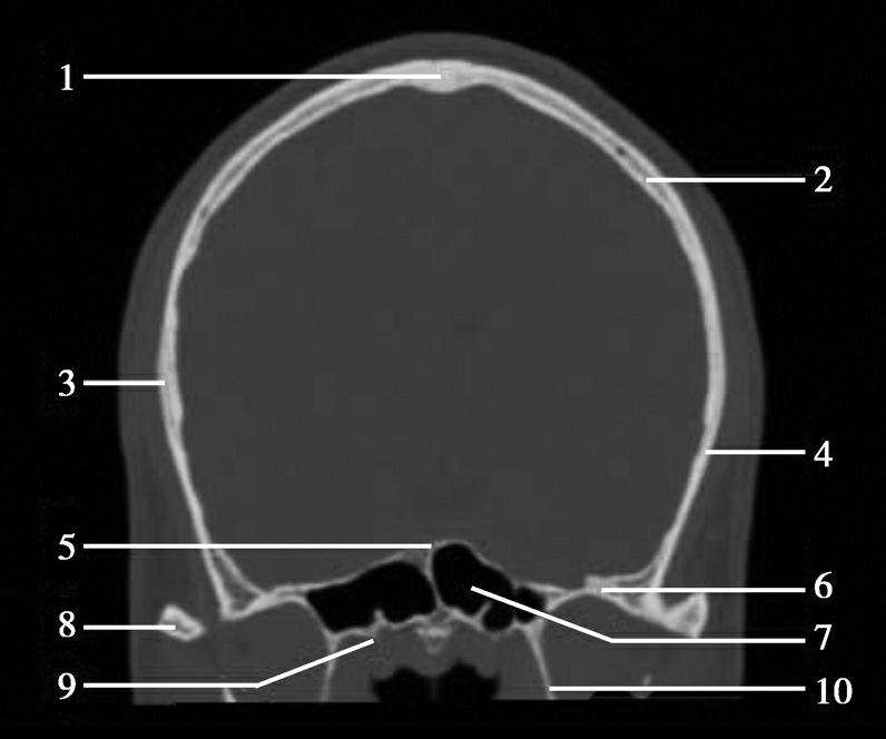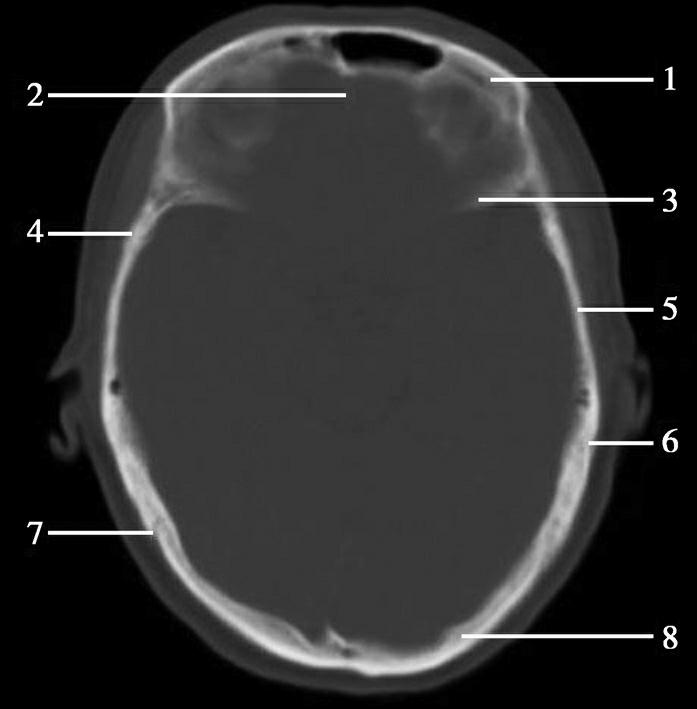 1.额骨;2.鸡冠;3.蝶骨大翼;4.蝶鳞缝;5.颞骨;6.顶颞缝;7.顶枕缝;8.枕骨
