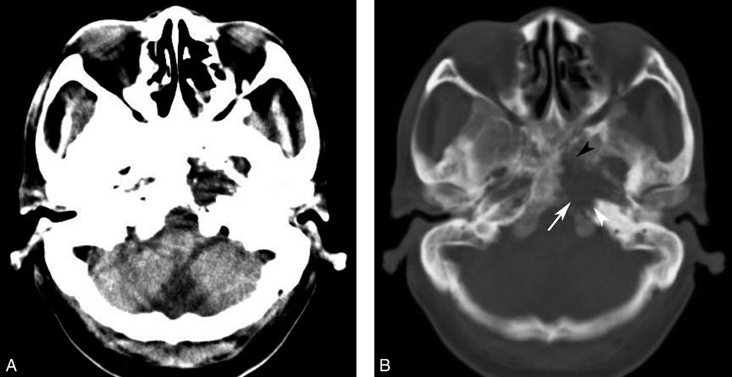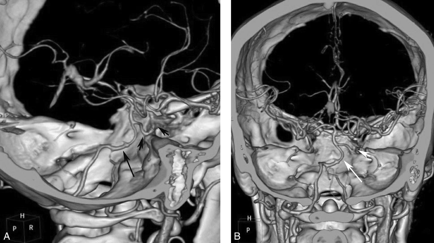 骨窗示左侧岩尖、斜坡、左侧蝶骨大翼骨质破坏、受侵(白箭),肿瘤经破裂孔侵入颅内(黑箭头)