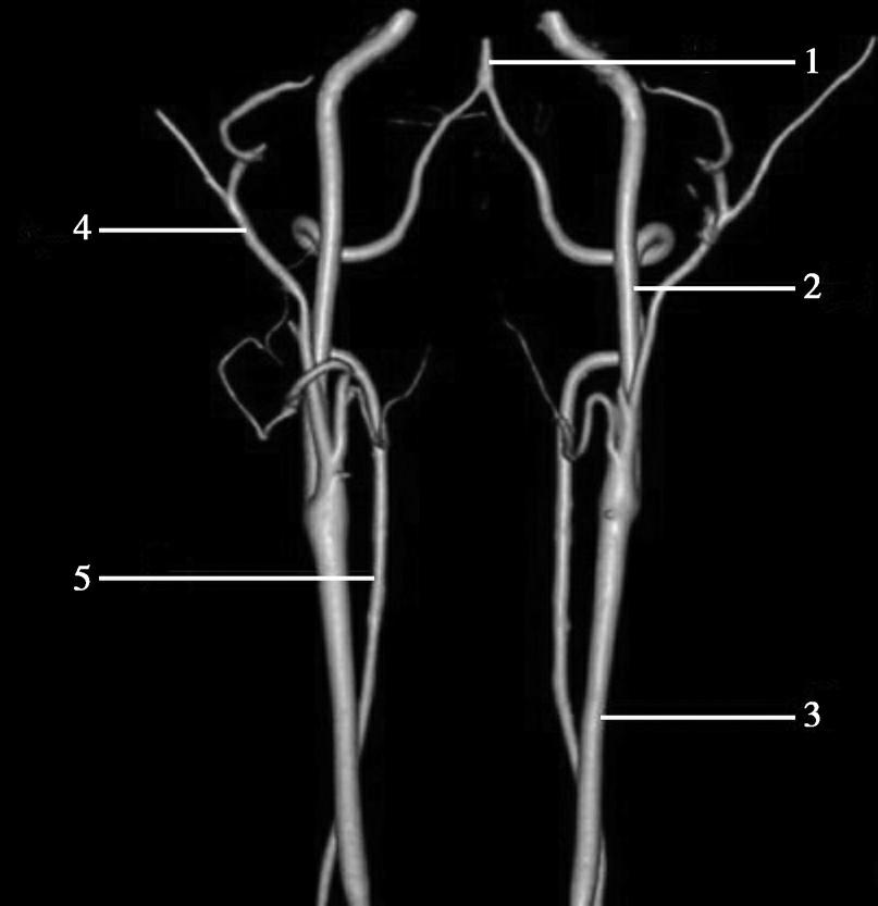 1.基底动脉;2.颈内动脉;3.颈总动脉;4.颈外动脉;5.椎动脉