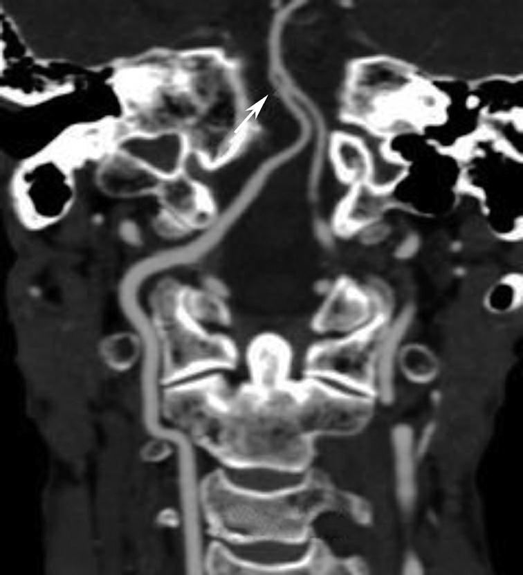 颅脑CTA示右侧颈内动脉C 7 段囊状突起(箭),表面光滑