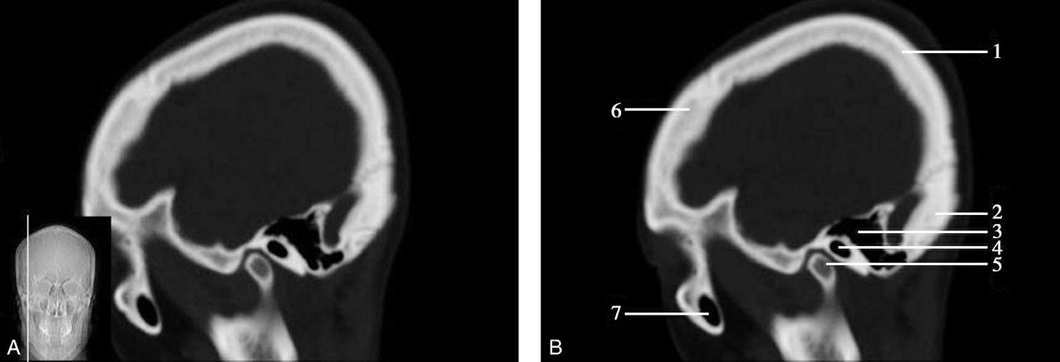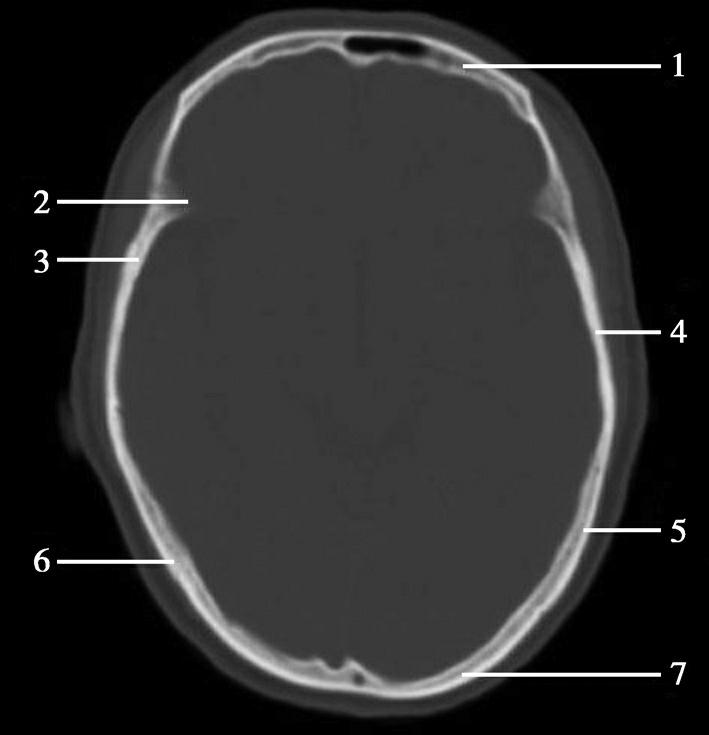 1.额骨;2.蝶骨大翼;3.蝶鳞缝;4.颞骨;5.顶骨;6.顶枕缝;7.枕骨