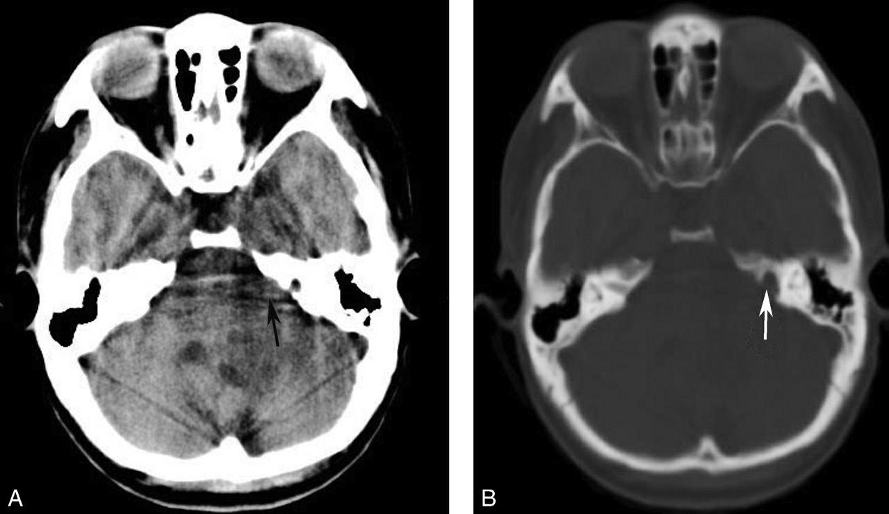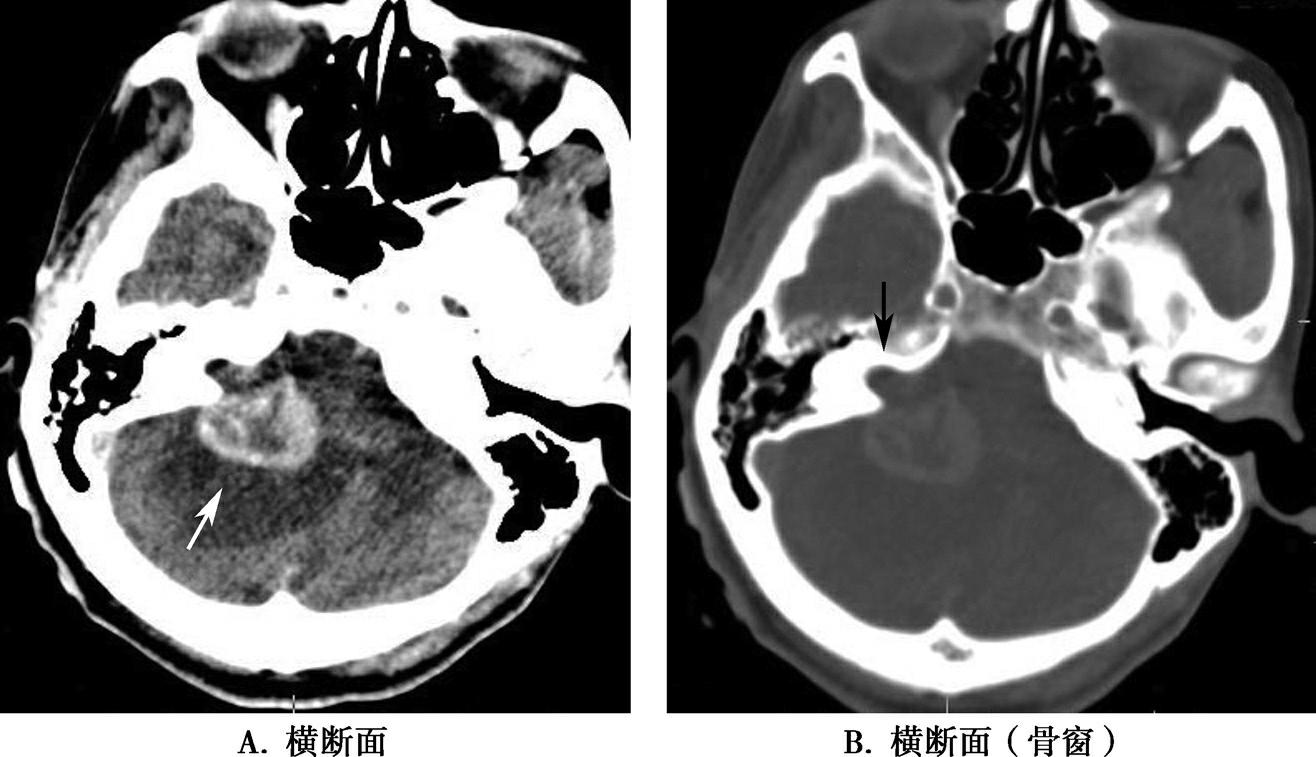 A.颅脑CT增强示右侧脑桥小脑三角区肿瘤明显不均匀性强化(箭);B.骨窗示右侧内听道明显扩大(箭)