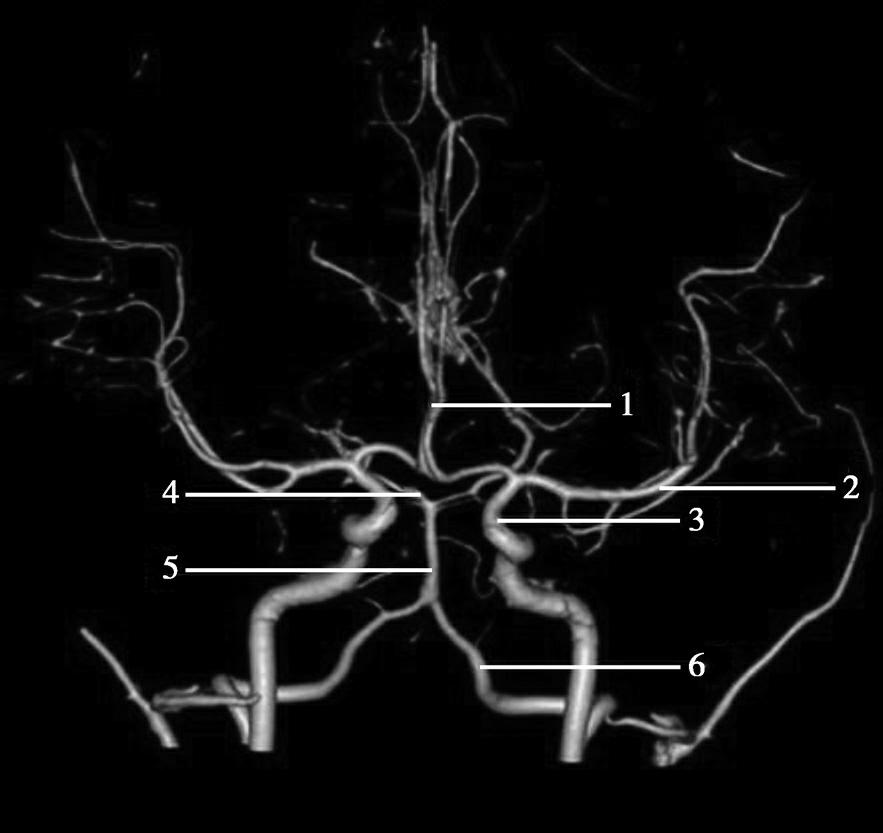 1.大脑前动脉;2.大脑中动脉;3.颈内动脉;4.大脑后动脉;5.基底动脉;6.椎动脉