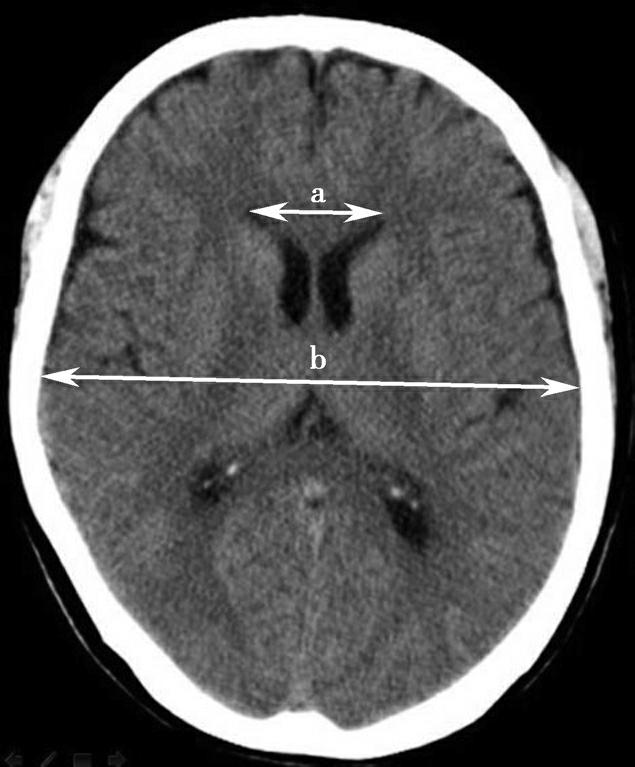 R=双侧侧脑室前角间径(a)/同平面脑横径(b)