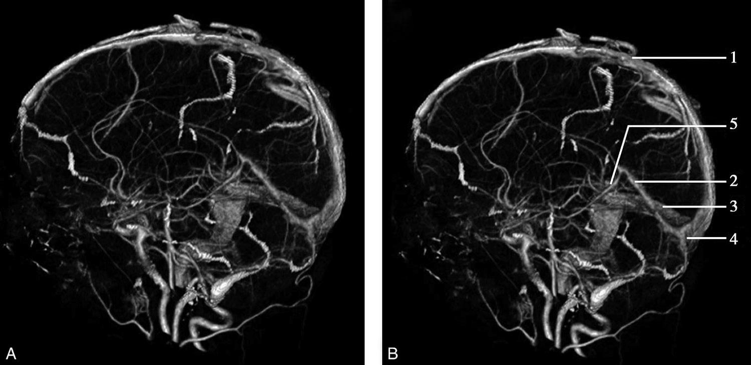 1.上矢状窦;2.直窦;3.乙状窦;4.窦汇;5.大脑大静脉