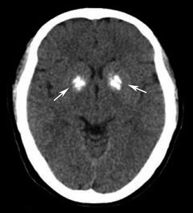 女,31岁,甲状旁腺机能减退。双侧基底节见大片钙化(箭)