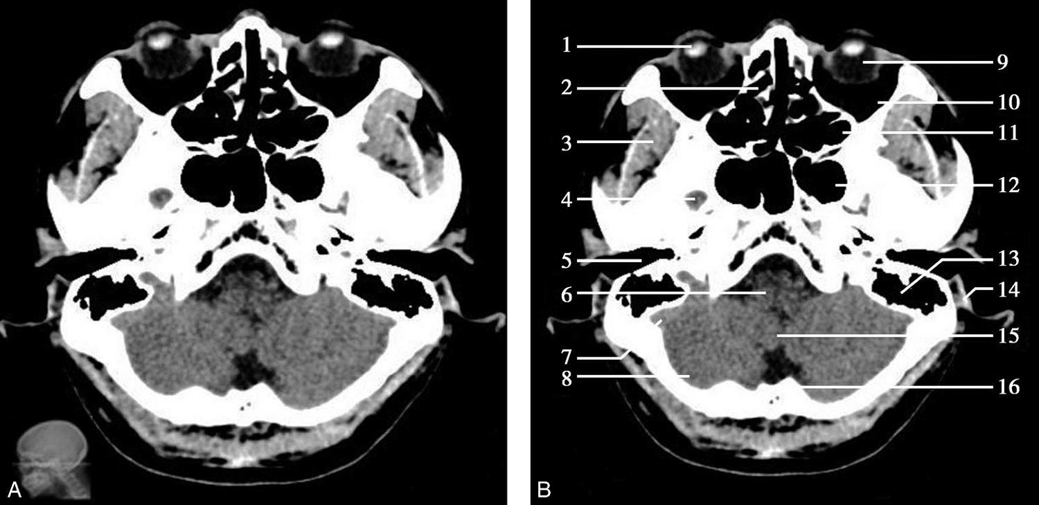 1.晶状体;2.筛窦;3.颞肌;4.中颅窝底;5.外耳道;6.延髓;7.乙状窦;8.小脑半球;9.眼球;10.眼眶;11.上颌窦;12.蝶窦;13.乳突;14.耳郭;15.小脑蚓部;16.枕内隆凸