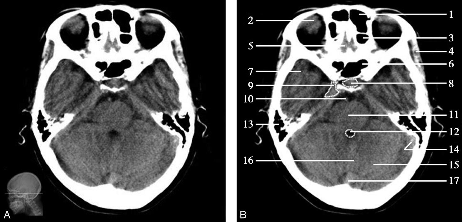 1.额窦;2.眼球;3.筛窦;4.颞肌;5.额底;6.蝶窦;7.颞叶;8.垂体;9.海绵窦;10.基底动脉;11.脑桥;12.第四脑室;13.乳突;14.乙状窦;15.小脑半球;16.小脑蚓部;17.窦汇